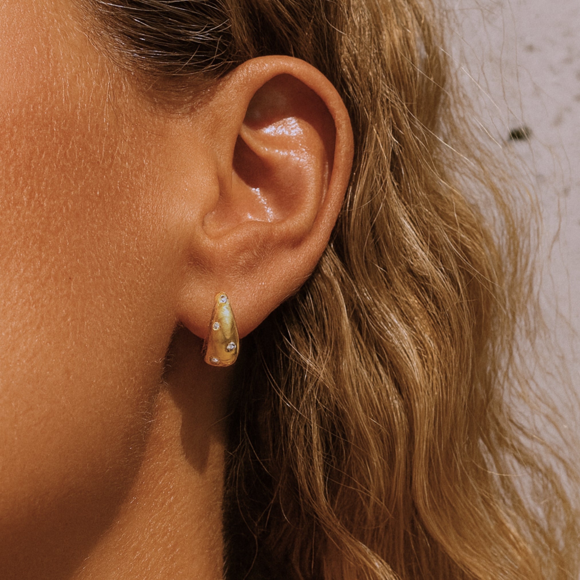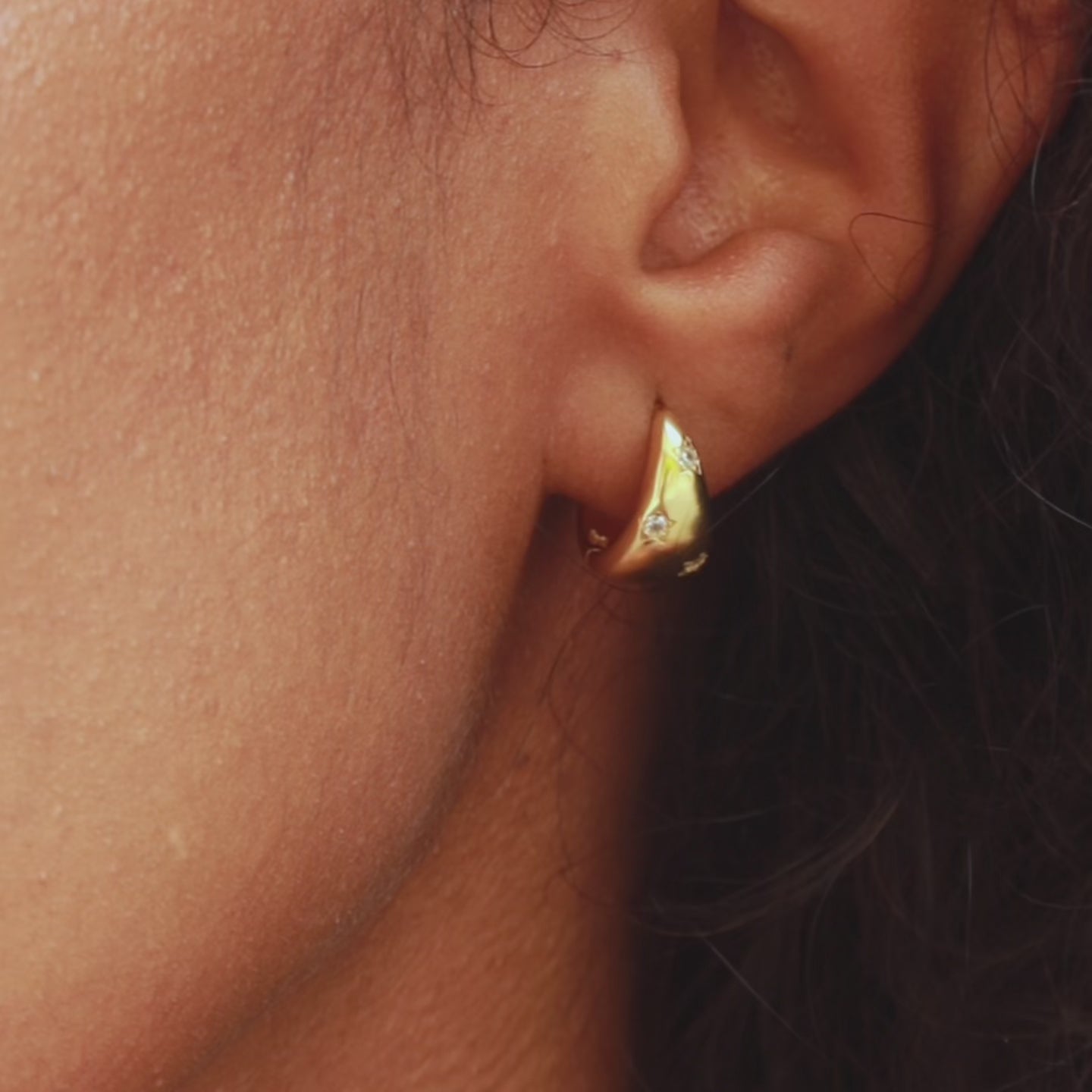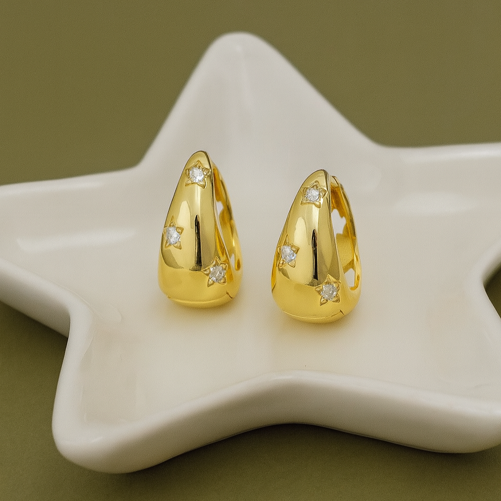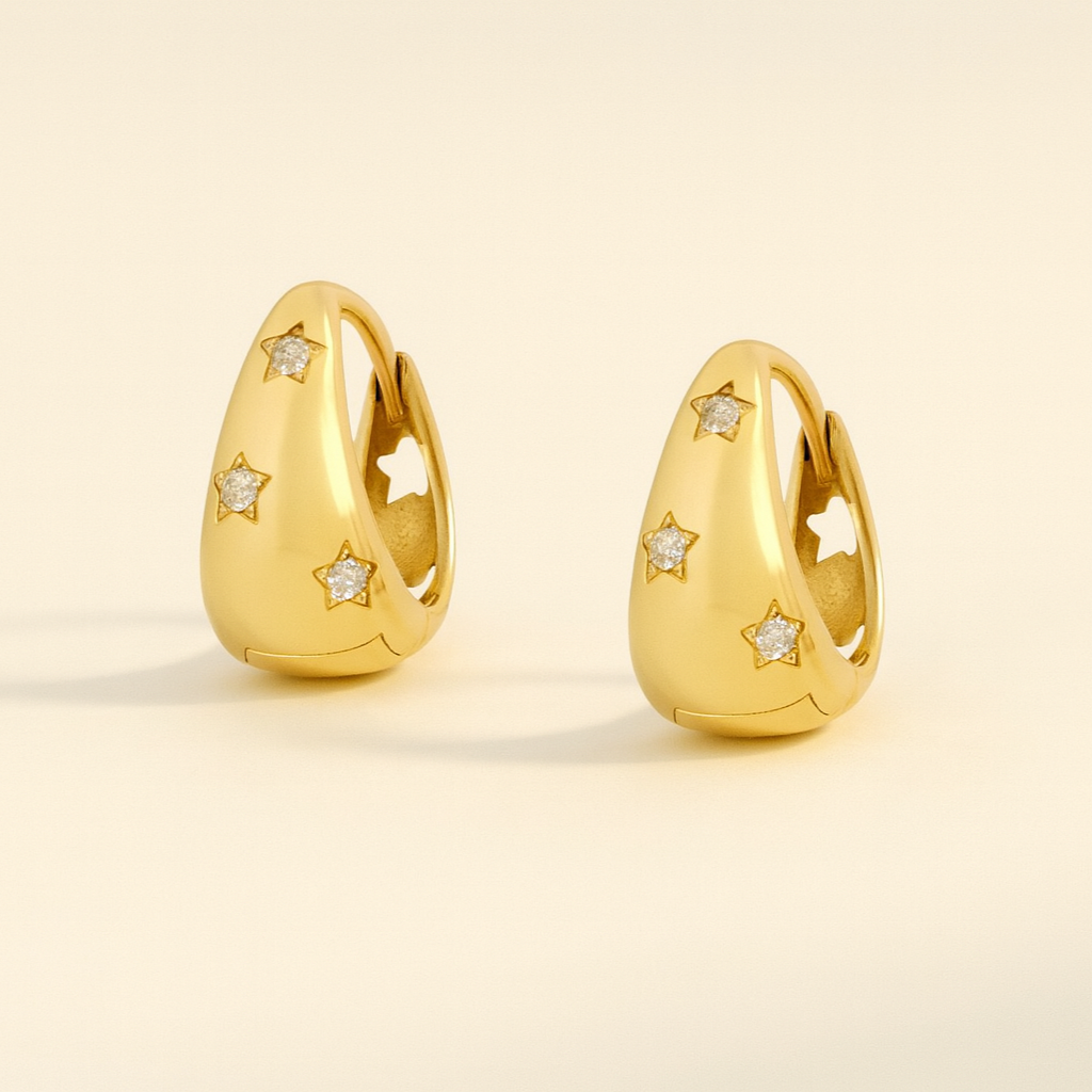 Inspired by starlit skies, the Starbeam Huggie Hoops bring subtle sparkle to your everyday look. Crafted in 925 sterling silver and plated with 18k gold, these mini hoops feature delicate star-cutouts set with glimmering cubic zirconia. Lightweight and comfortable, they’re perfect for layering or wearing solo. A refined piece that whispers rather than shouts — quietly radiant.