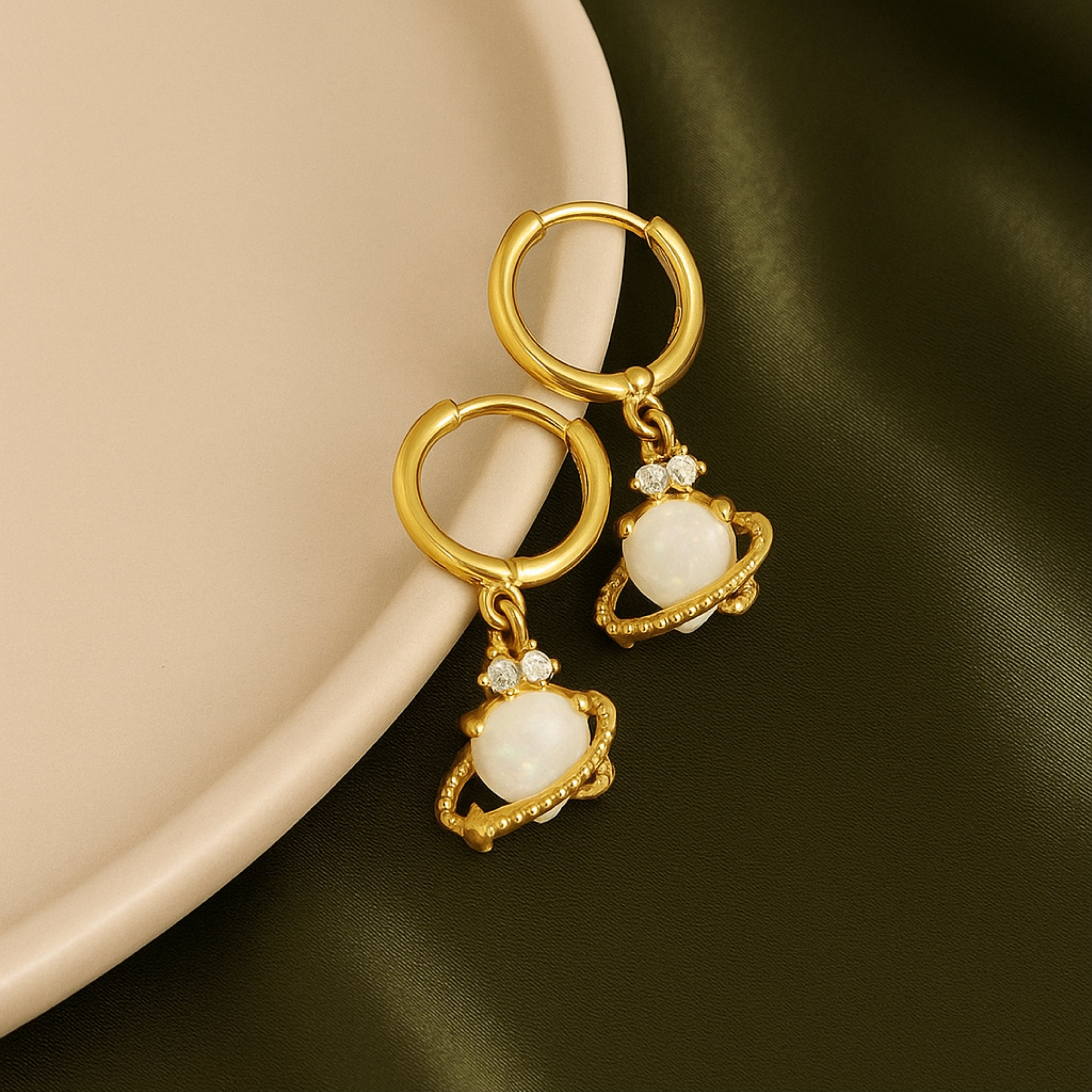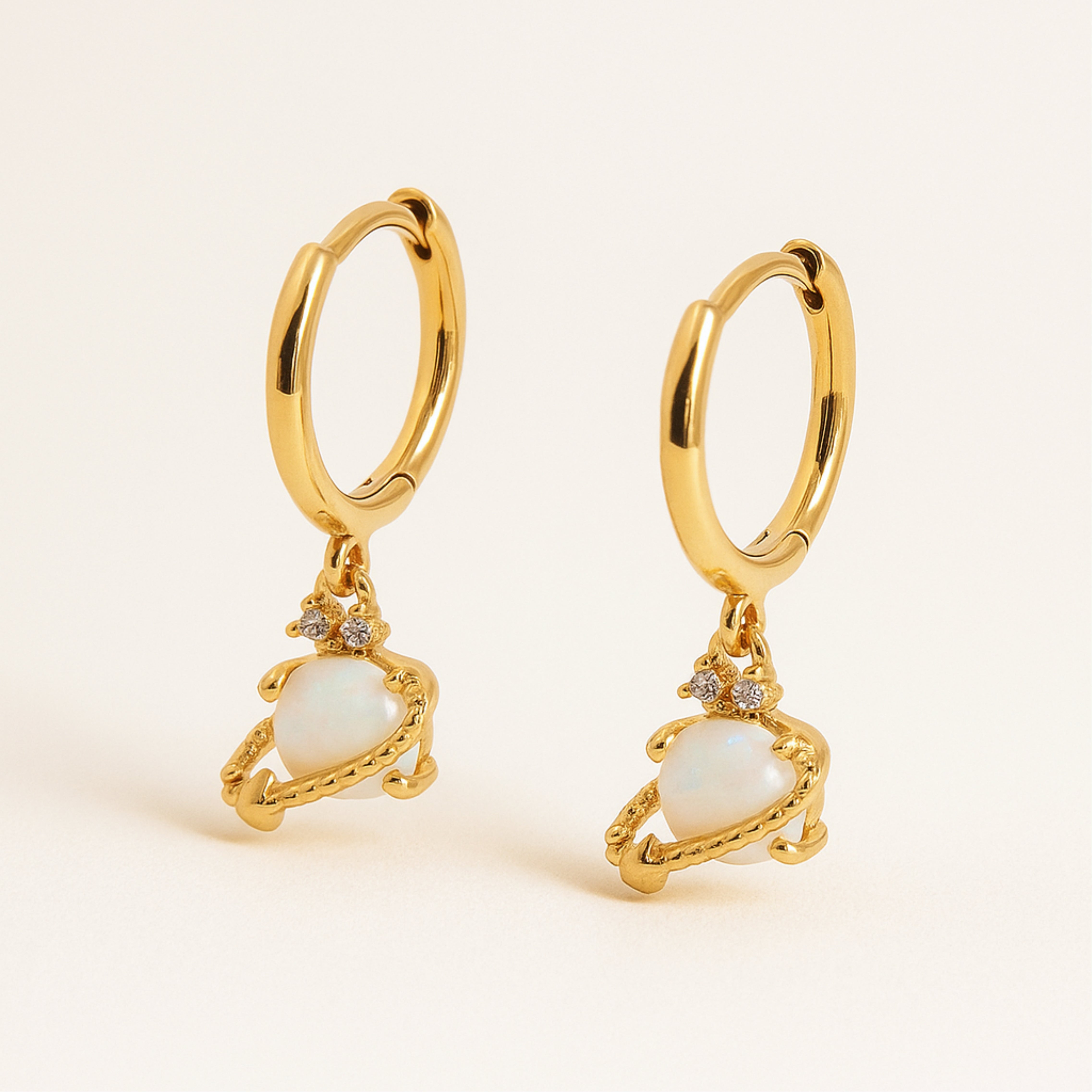These Opal Planet Huggie Earrings showcase milky-white opal spheres encircled by beaded gold “rings,” crowned with a sprinkle of cubic-zirconia stars. Dangling from 18 K gold-plated hoops, they add a playful cosmic glow that’s light enough for all-day wear but dazzling enough for date night. Pair them with minimalist studs for a subtle galaxy vibe, or stack with other celestial pieces for a full look.