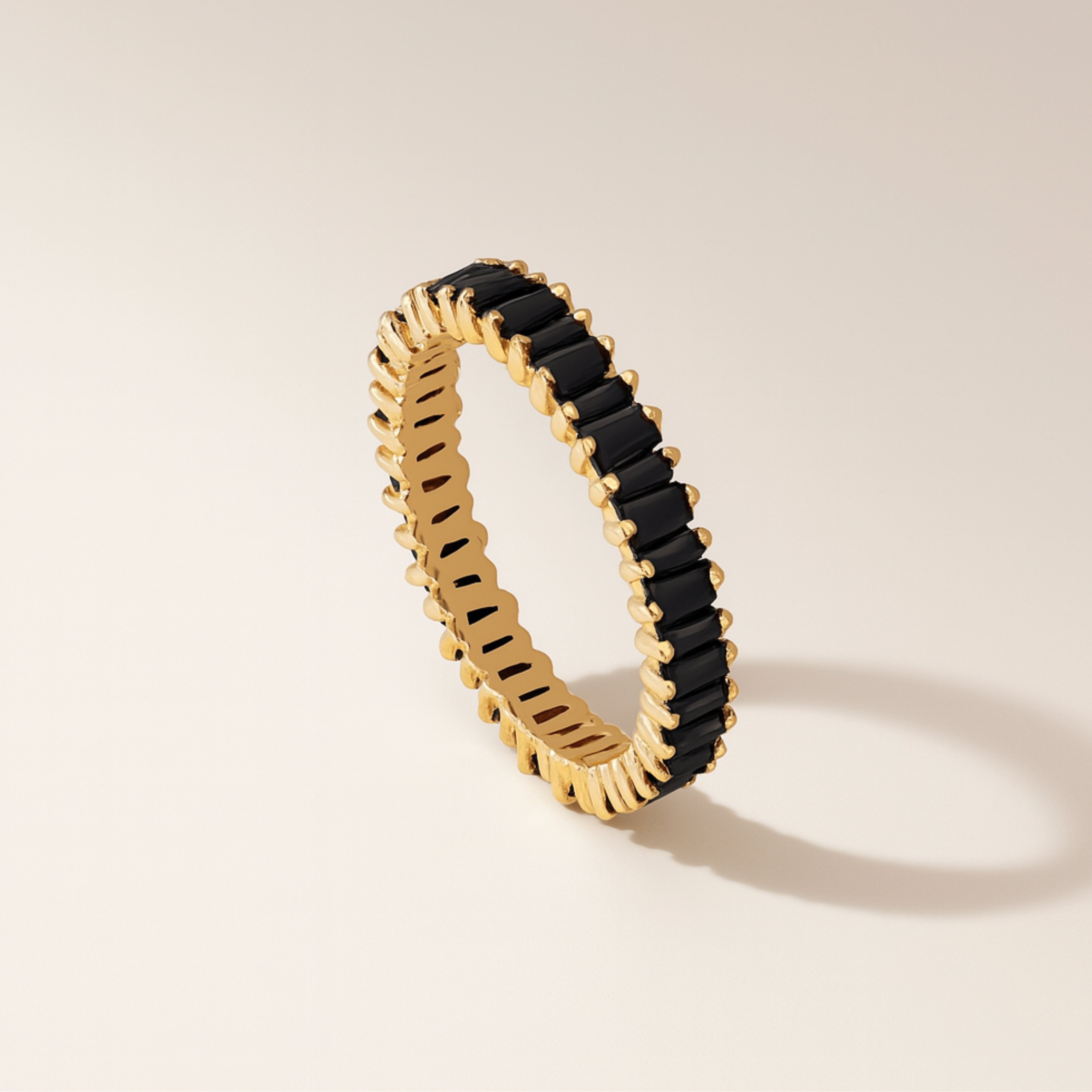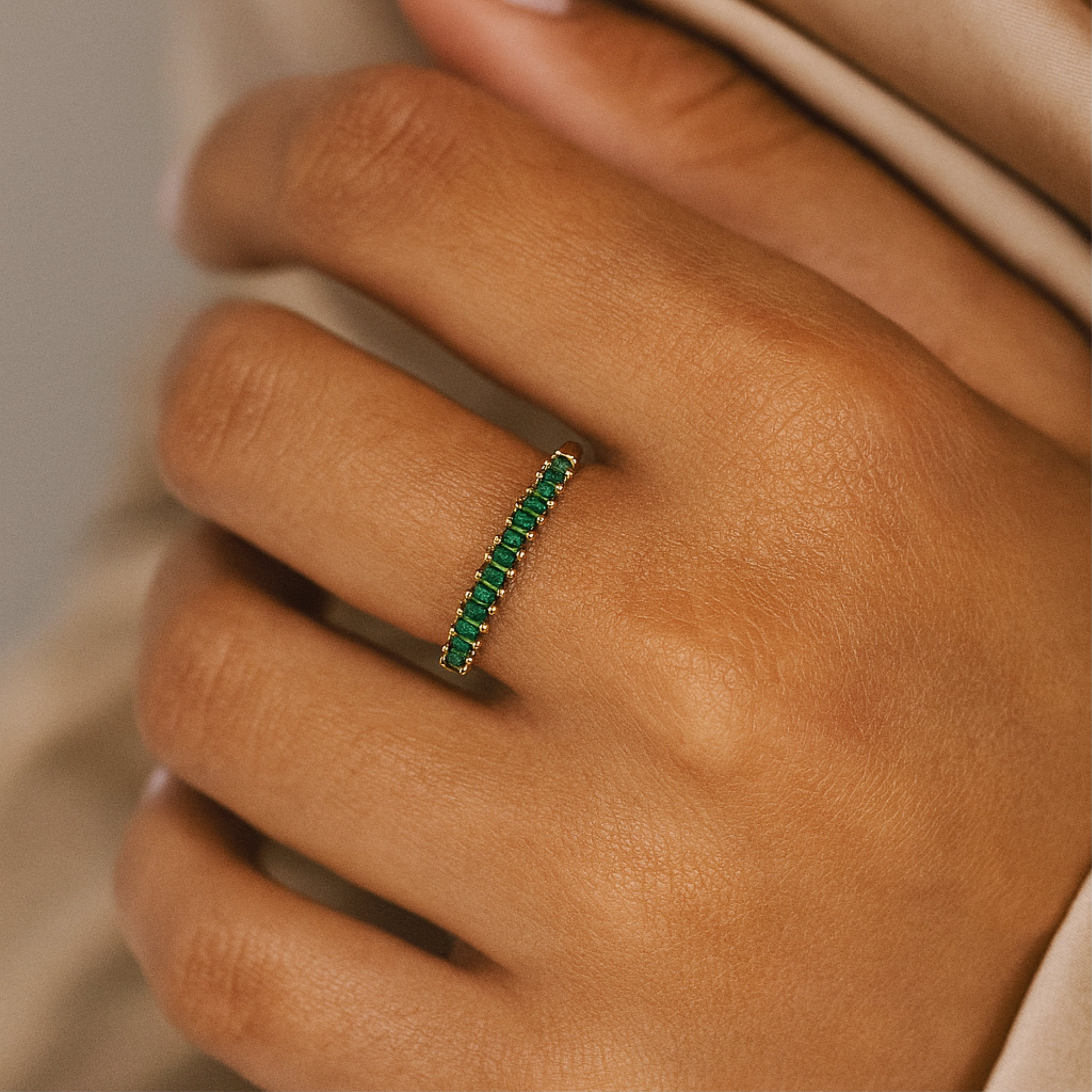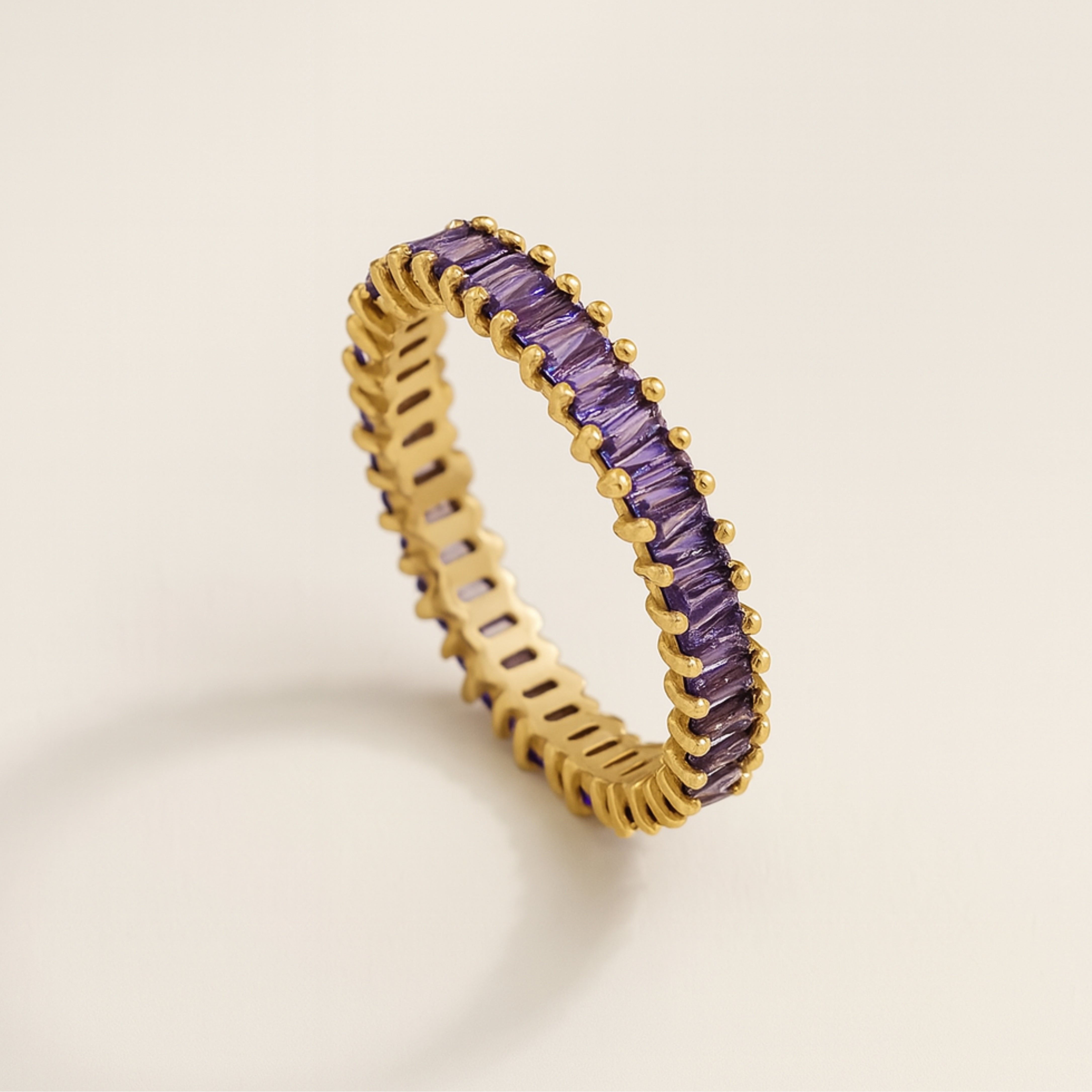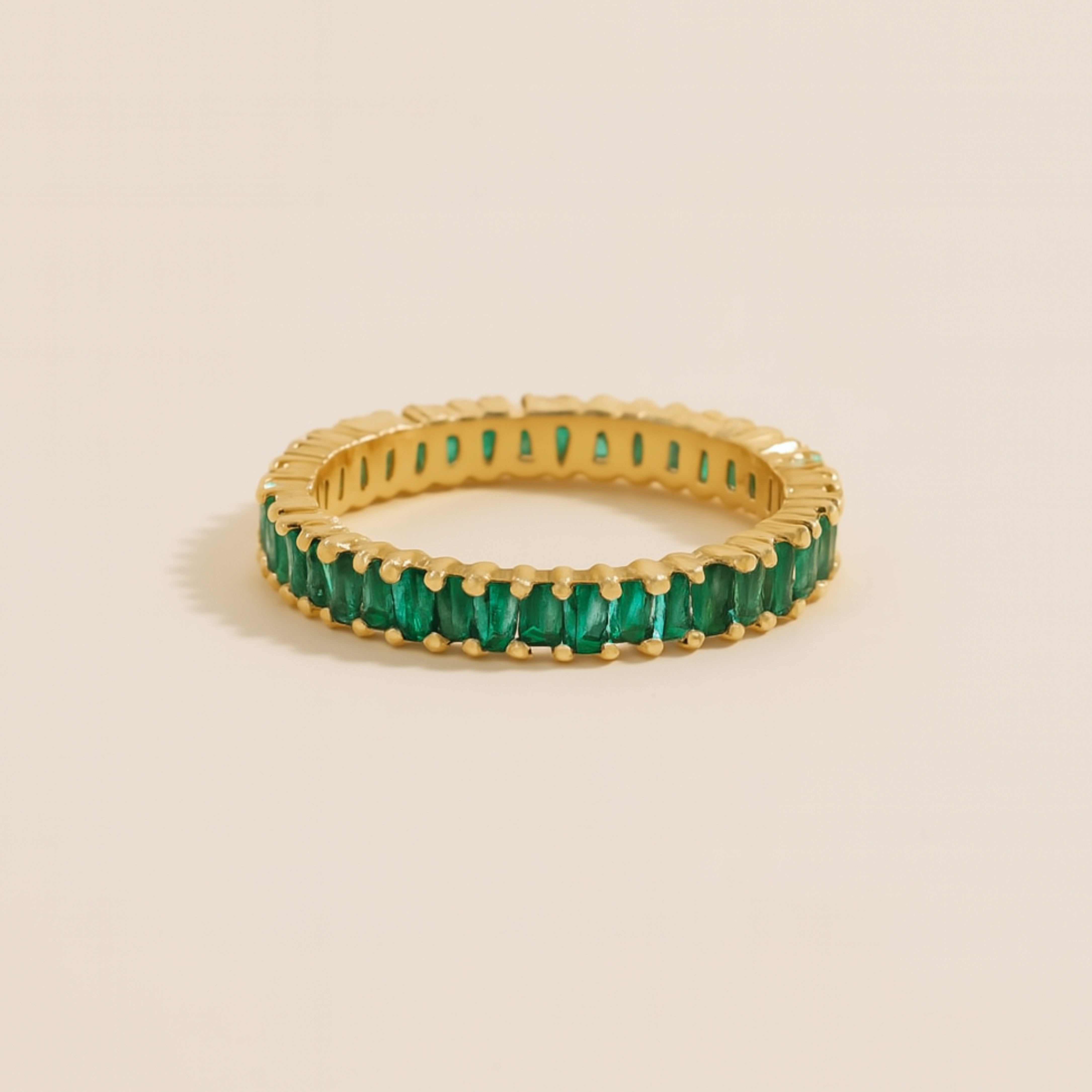 Bring runway colour to your everyday stack with our Tri-Color Baguette Eternity Ring Set. Each slim band is fully paved in hand-cut baguette-shape cubic-zirconia—rich emerald green, brilliant diamond-clear and dreamy amethyst purple—secured in a 18k gold–plated claw setting that lets light flood every facet. Wear a single shade for crisp minimalism, layer all three for high-impact sparkle, or split the set with friends as matching friendship rings. Hypoallergenic and nickel-free, these eternity bands promise comfortable glamour from morning latte to late-night champagne.