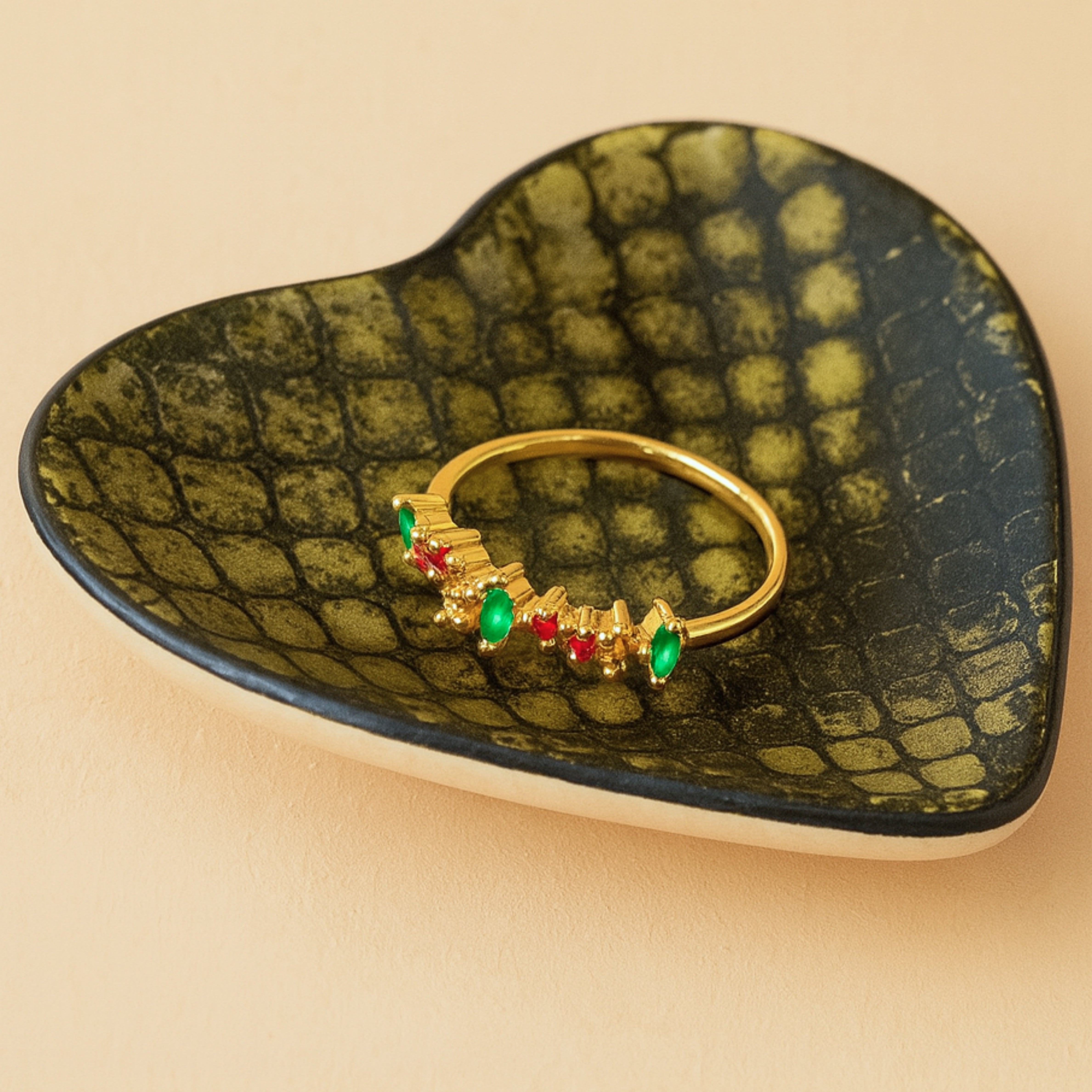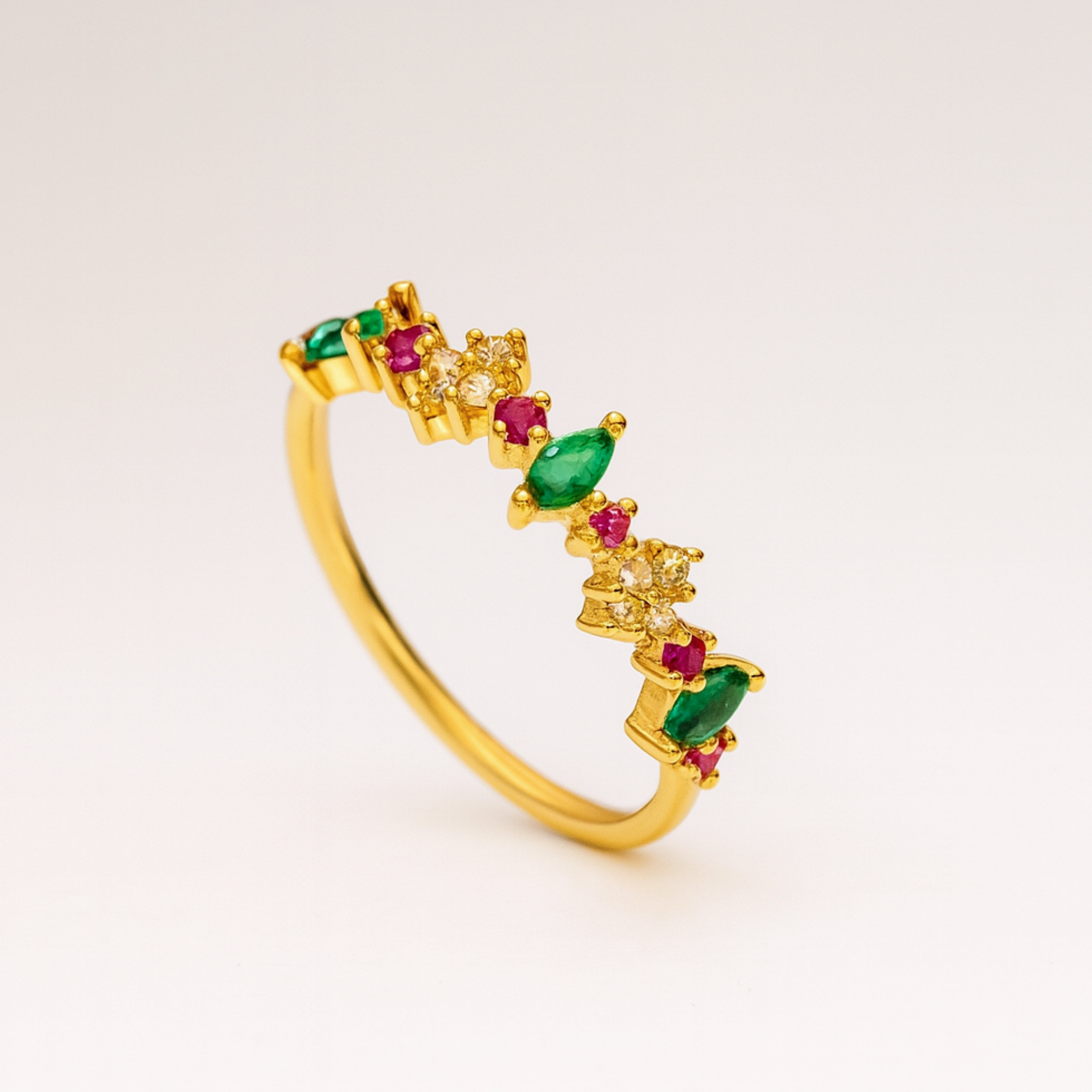 Like wildflowers scattered across a summer lawn, our Confetti Bloom Ring wraps a slim 18 K gold-plated band in a playful garland of gemstone color. Marquise-cut emerald-green CZ leaves sit between fuchsia-pink rounds and tiny golden CZ blossoms, creating a lively mix of shapes and hues. Cast on a hypoallergenic 925 sterling-silver core, the ring is feather-light and perfectly sized for stacking. Wear it solo for a cheerful pop of color or layer it with plain gold bands to build your own floral story—ideal for garden weddings, vacations, or brightening a work-day outfit.
