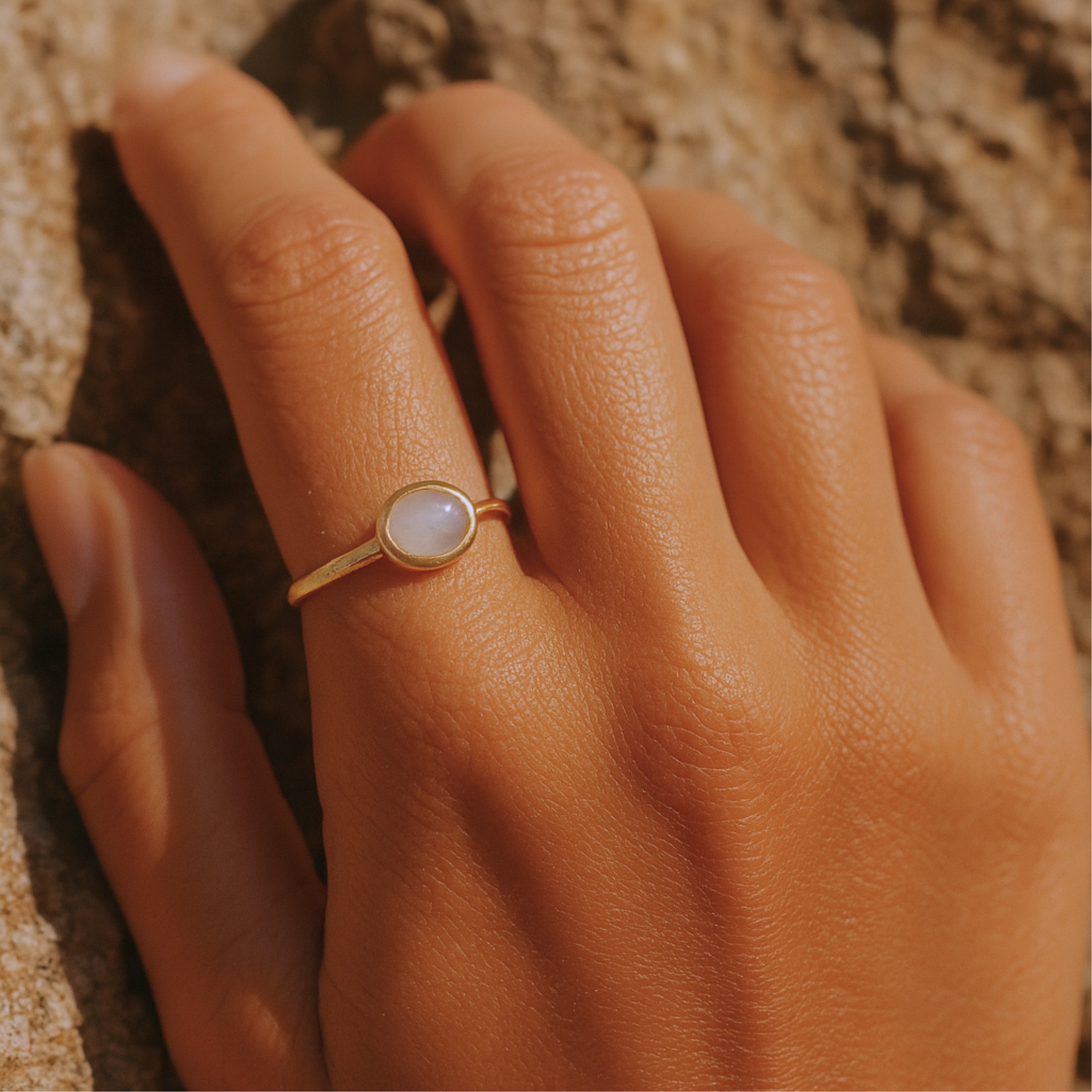 Small ring, big magic. Moonbeam Oval sets a luminous oval moonstone into a sleek low-profile bezel and slides it onto a thin 18 K gold silver band. A weightless glow that works with everything—your Monday jeans, your bridesmaid dress, your midnight latte run. Hand-crafted on solid 925 sterling silver, the piece is nickel-free and ready to stack with your favorite gold midi bands or shine solo as your daily moonlight.