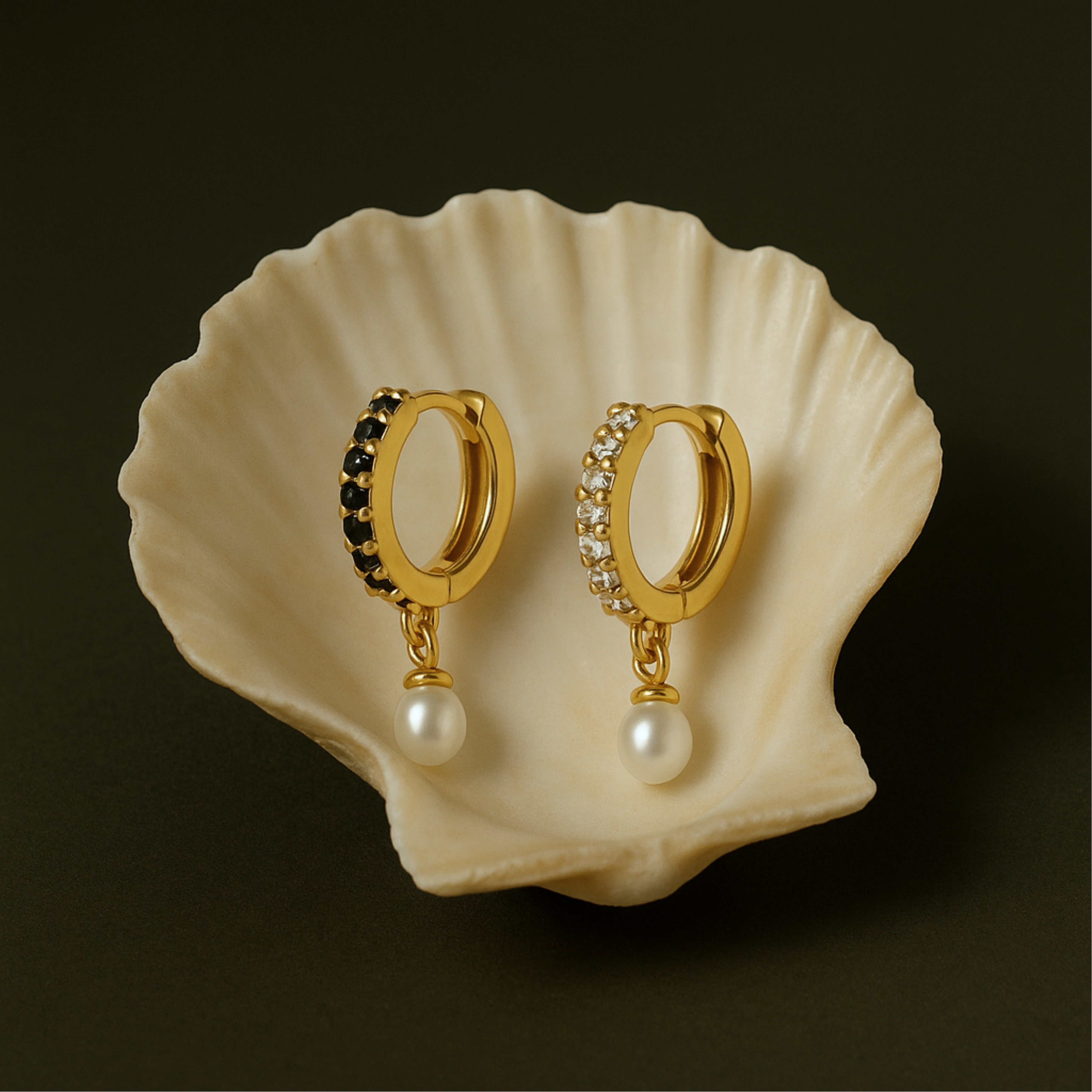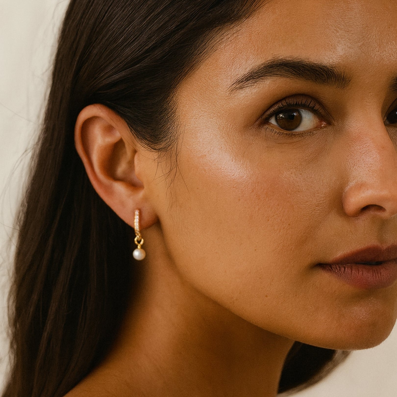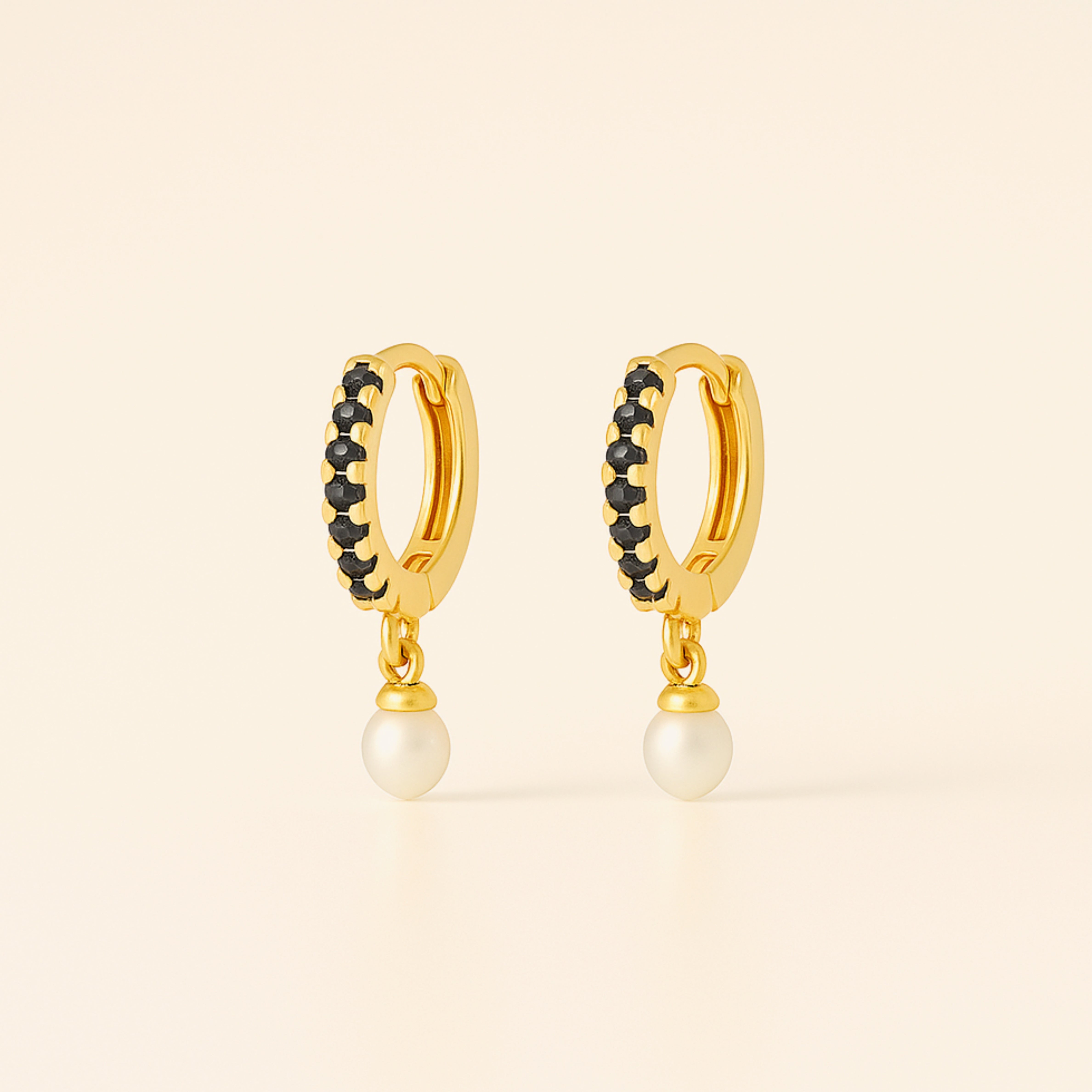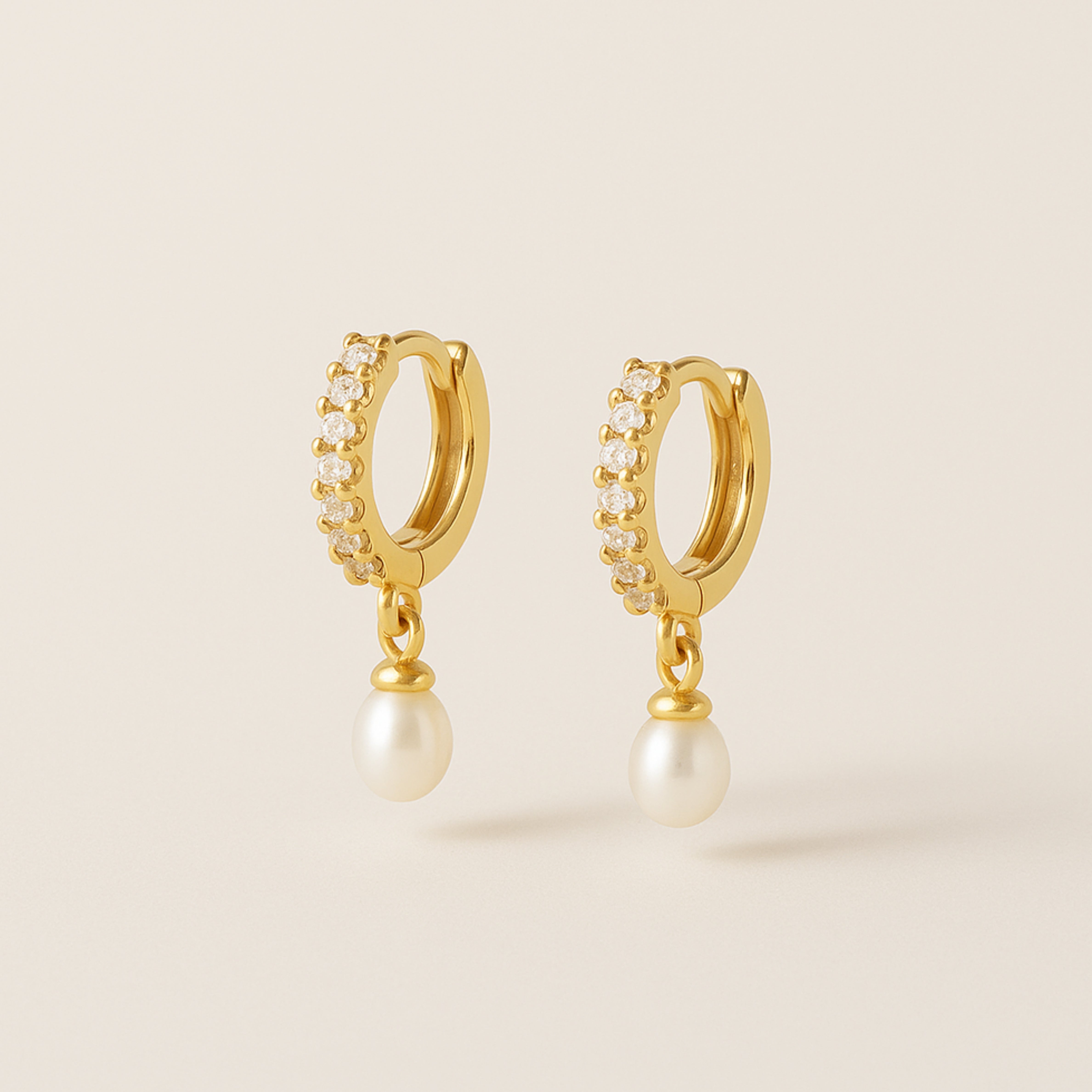 A timeless silhouette with a soft, modern glow. The Pearl Drop Earrings are crafted in 925 sterling silver, plated in 18k gold, and adorned with radiant white zirconia. A luminous pearl gently sways from each hoop, making them the perfect finish to both daytime ease and evening refinement. Lightweight, elegant, and full of quiet sophistication.