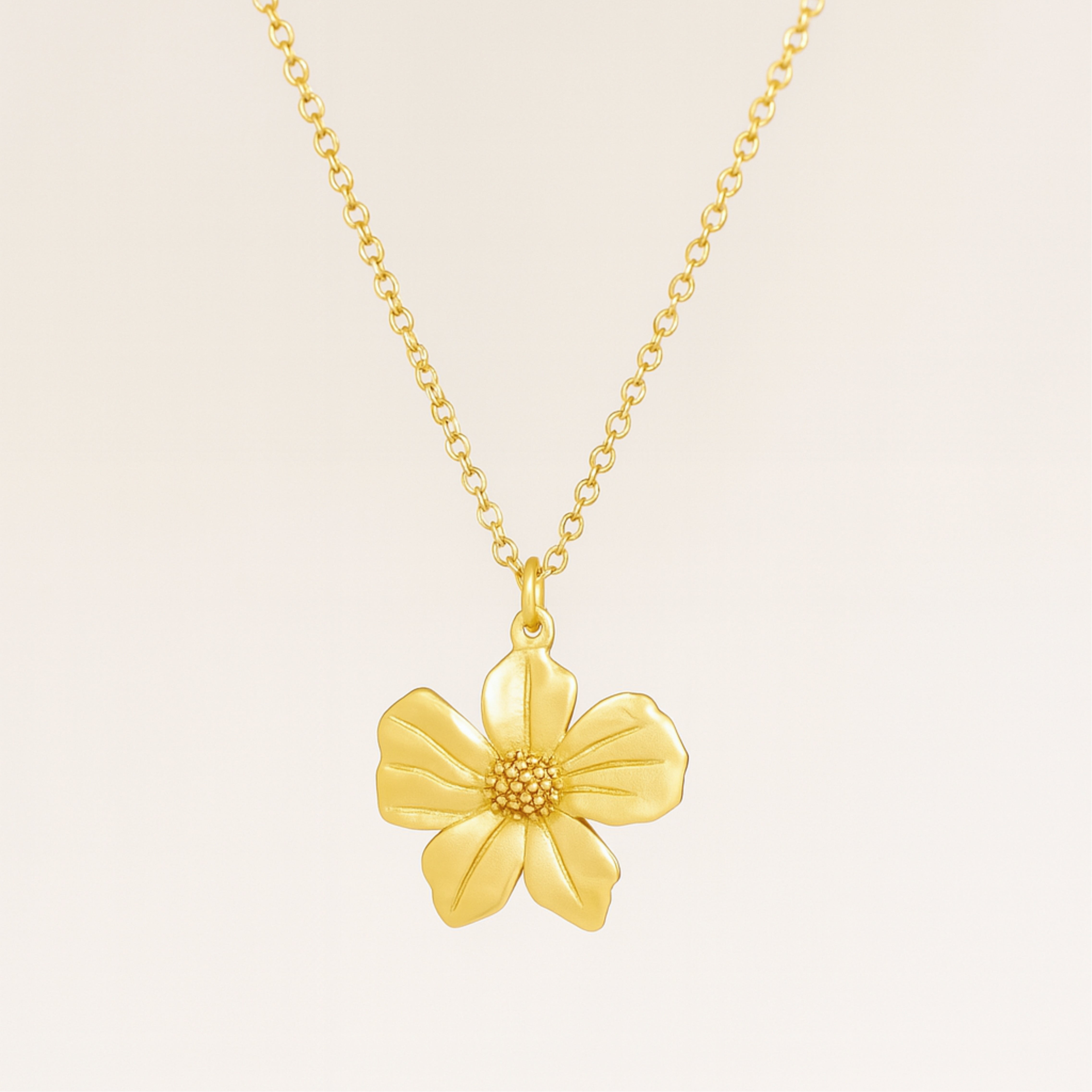 Inspired by the delicate beauty of spring blossoms, the Golden Bloom Necklace is a timeless piece that radiates warmth and femininity. The detailed flower pendant, finished in lustrous gold, symbolizes growth, grace, and new beginnings. Whether worn alone or layered, it's the perfect everyday reminder of nature's gentleness.