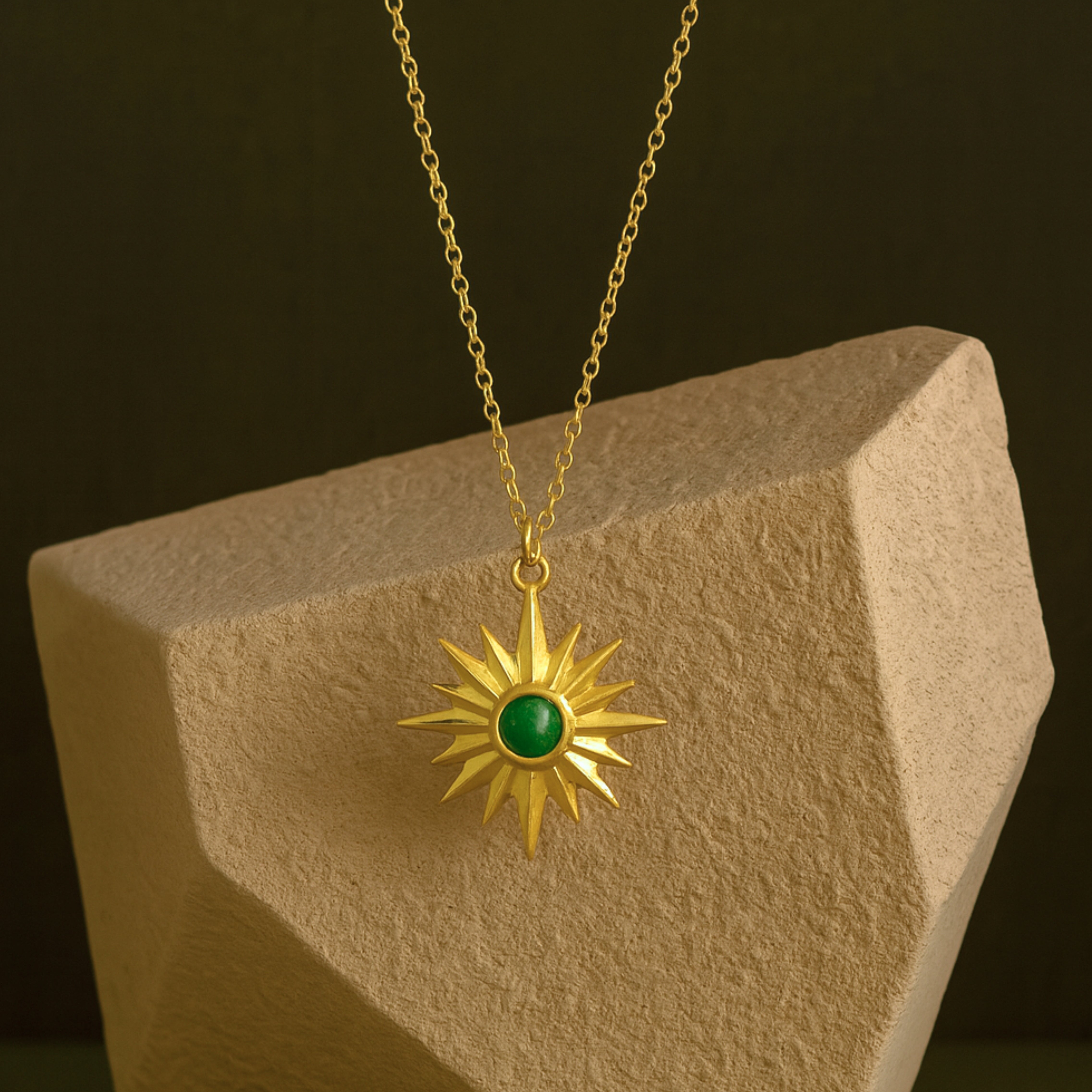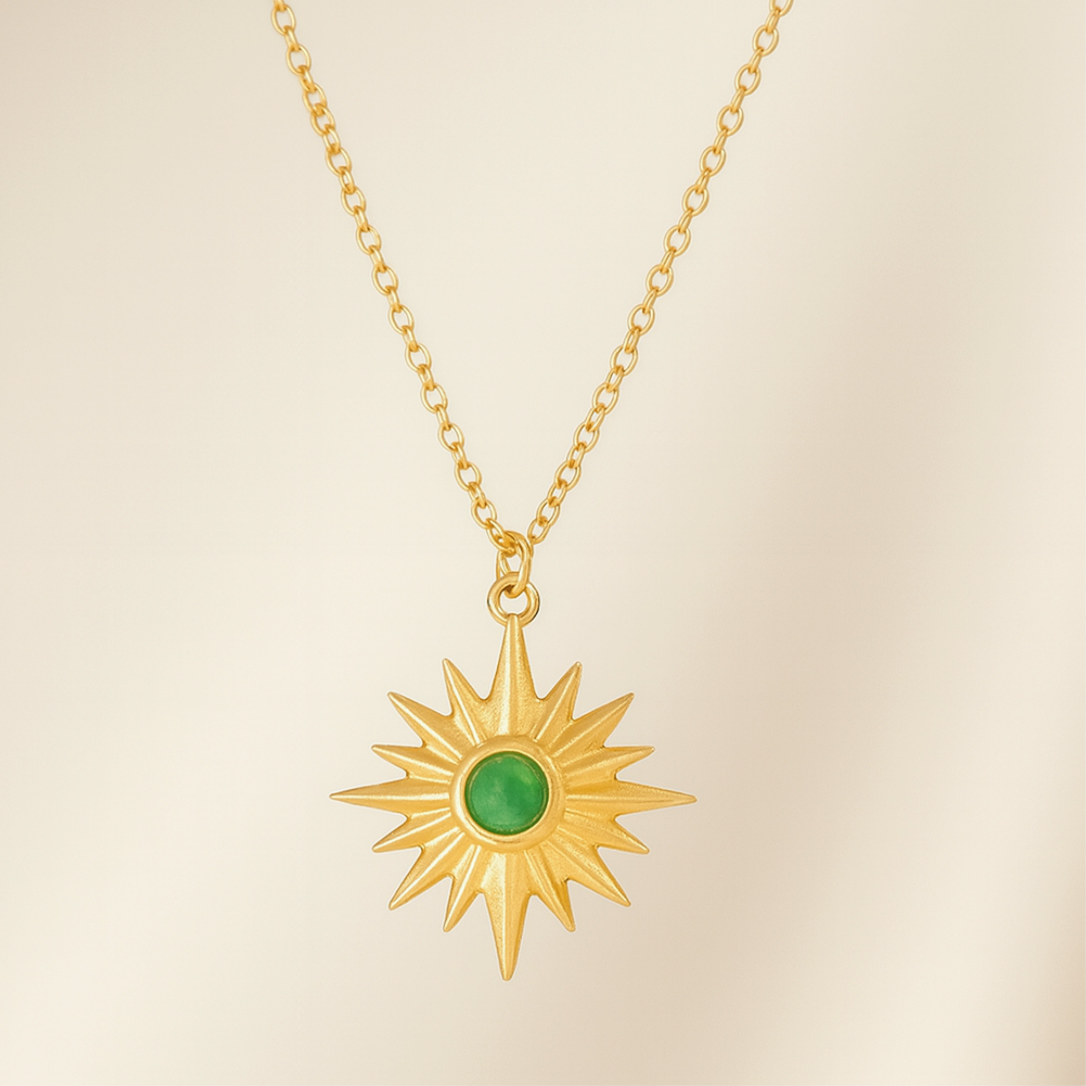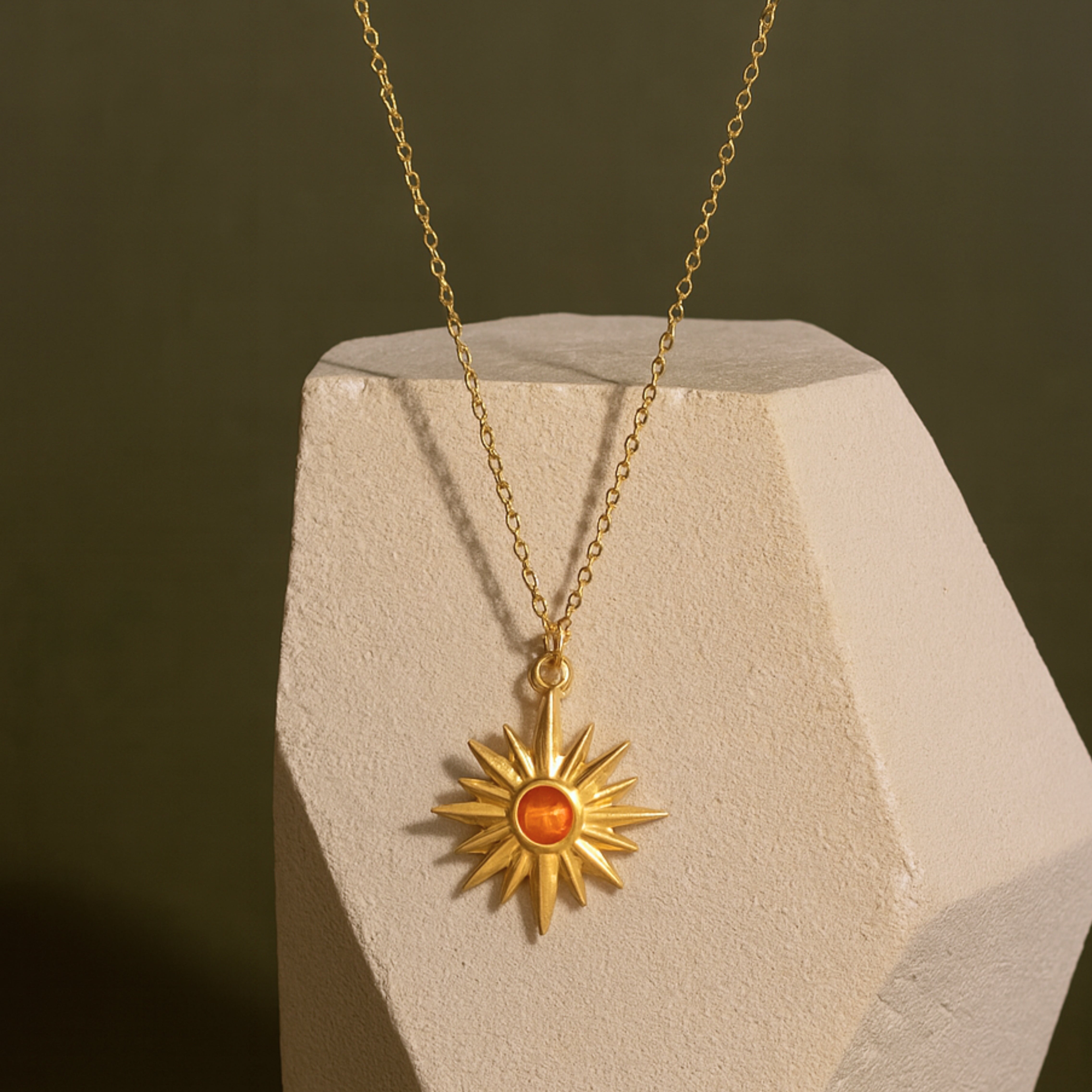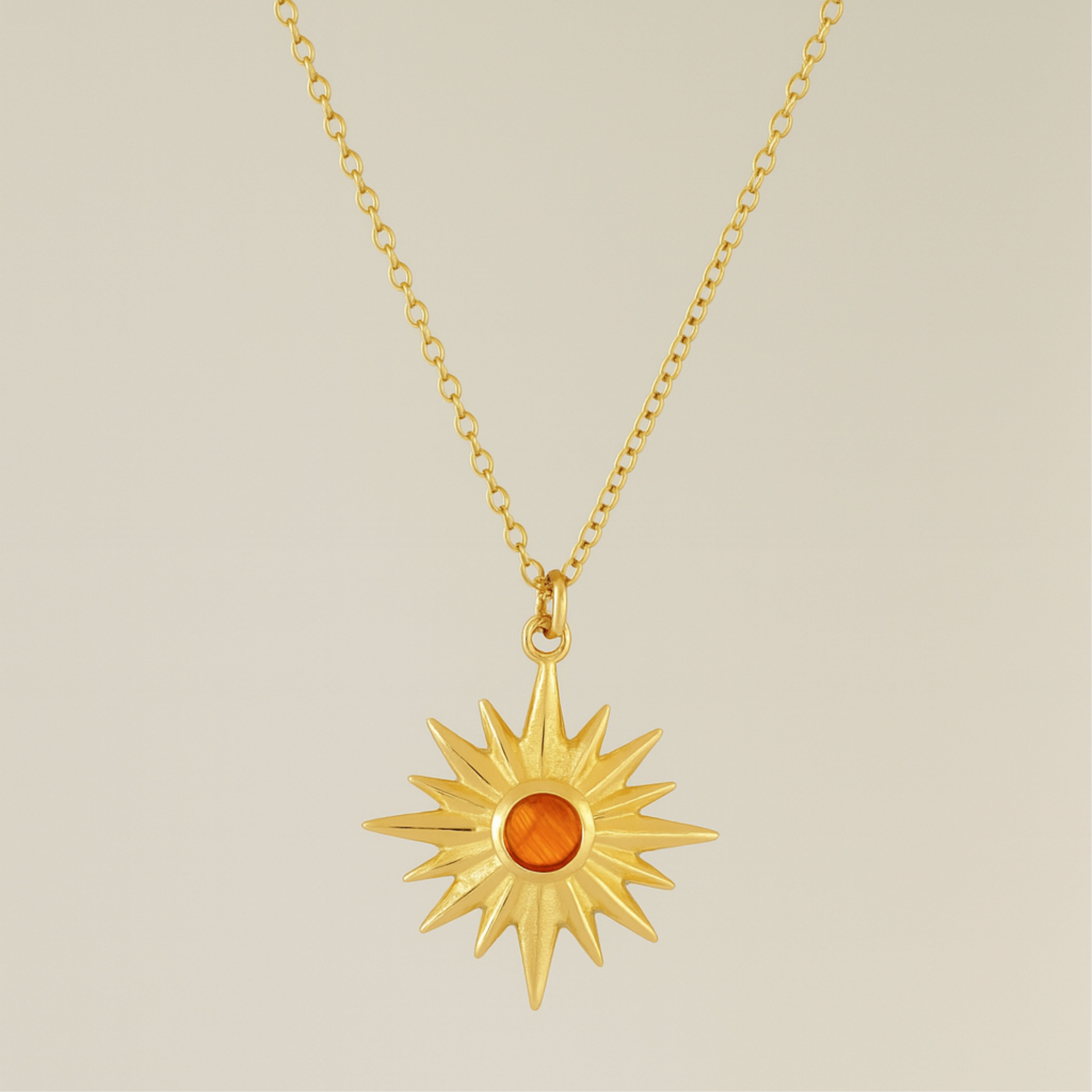 The Golden Ray Necklace captures the warmth and strength of the sun in a striking design. Featuring a bold gold sunburst pendant with a radiant orange center, this piece embodies energy, optimism, and timeless style. Whether worn on its own or layered with other favorites, it's the perfect everyday talisman for those who light up every room they enter.