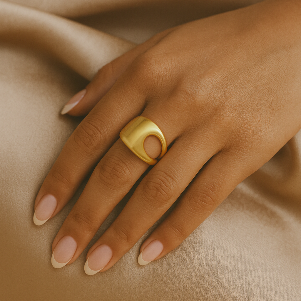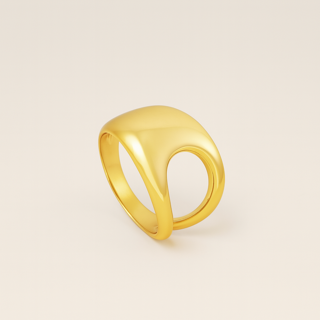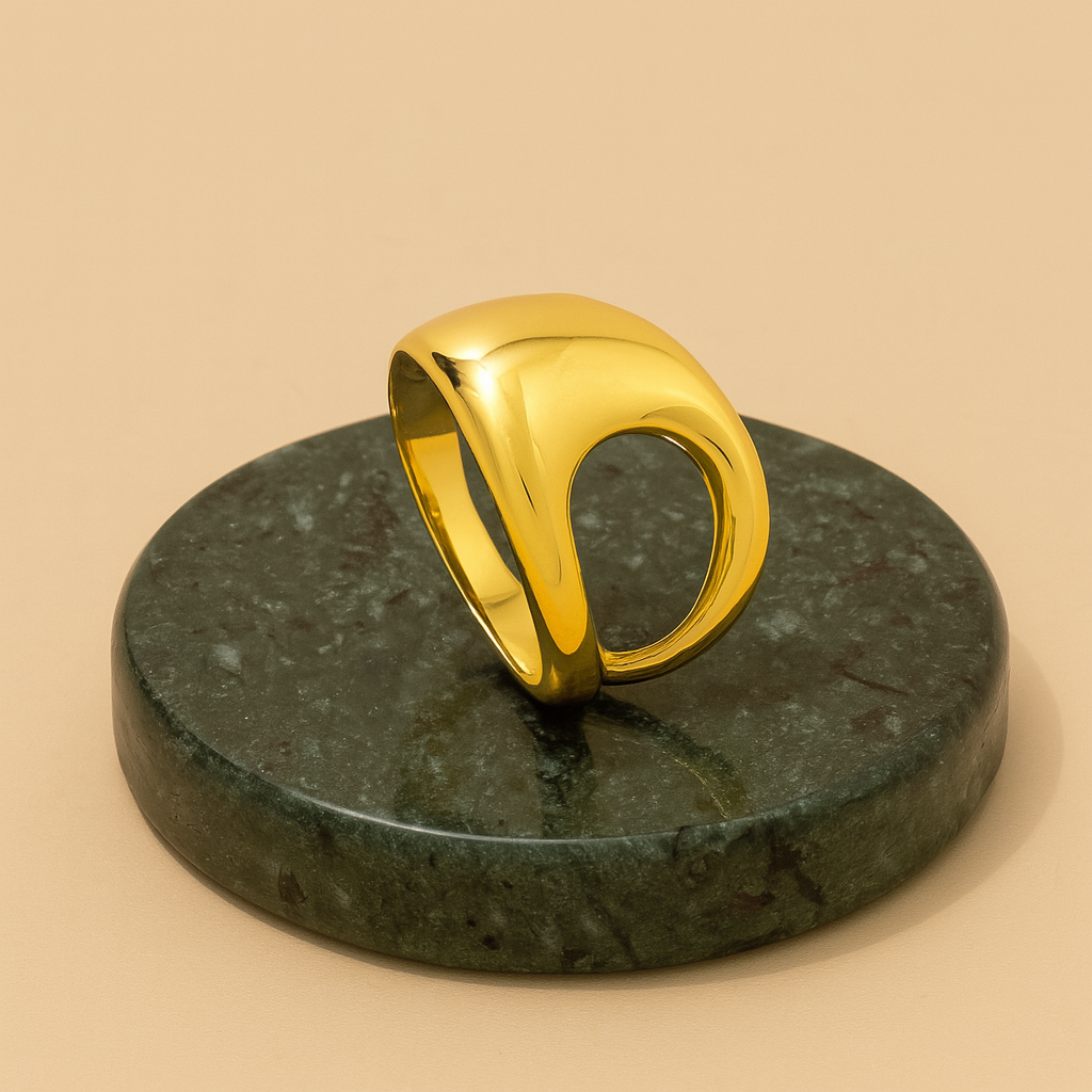 A fluid form that makes a quiet statement. The Sculpted Open Dome Ring blends architecture and elegance with its soft curve design. Crafted from solid 925 sterling silver and plated in 18k gold, this piece is made to stand out — yet remains effortlessly wearable. Whether worn solo or paired with your everyday favorites, it brings a sculptural edge to any look. Polished to a mirror finish, it reflects both light and intention.