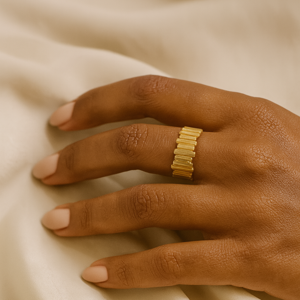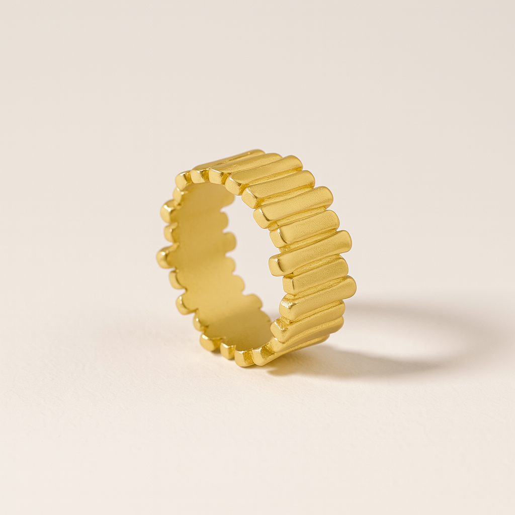 Structured. Sculptural. Striking. The Segmented Band Ring is a modern take on classic stacking rings — designed with bold, rounded segments that wrap the finger in rhythm and texture. Crafted in solid 925 sterling silver and finished in thick 18k gold, this piece feels strong yet effortless. Its architectural form adds instant edge, whether worn solo or styled with minimal bands for contrast. Made for those who love clean lines and unexpected detail.