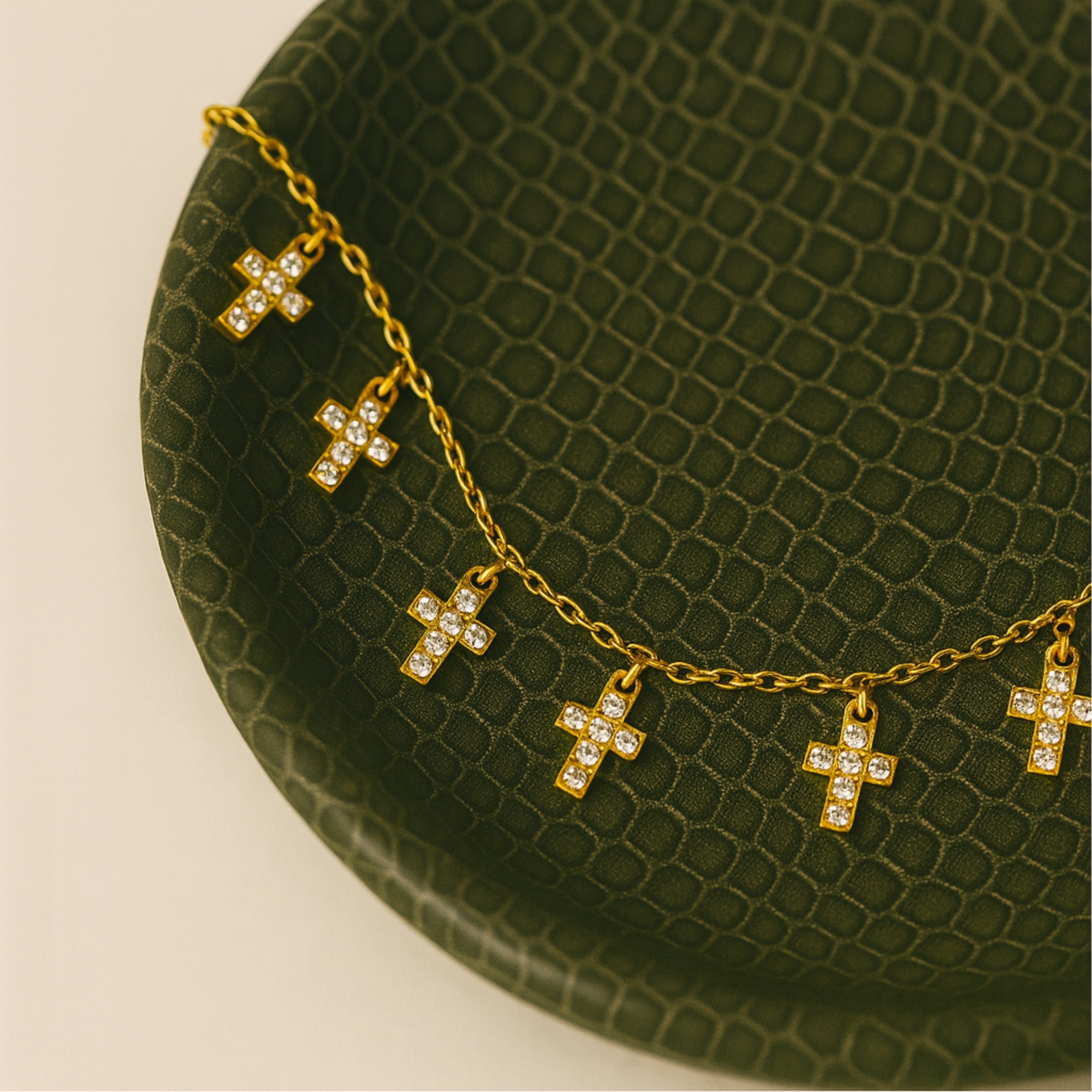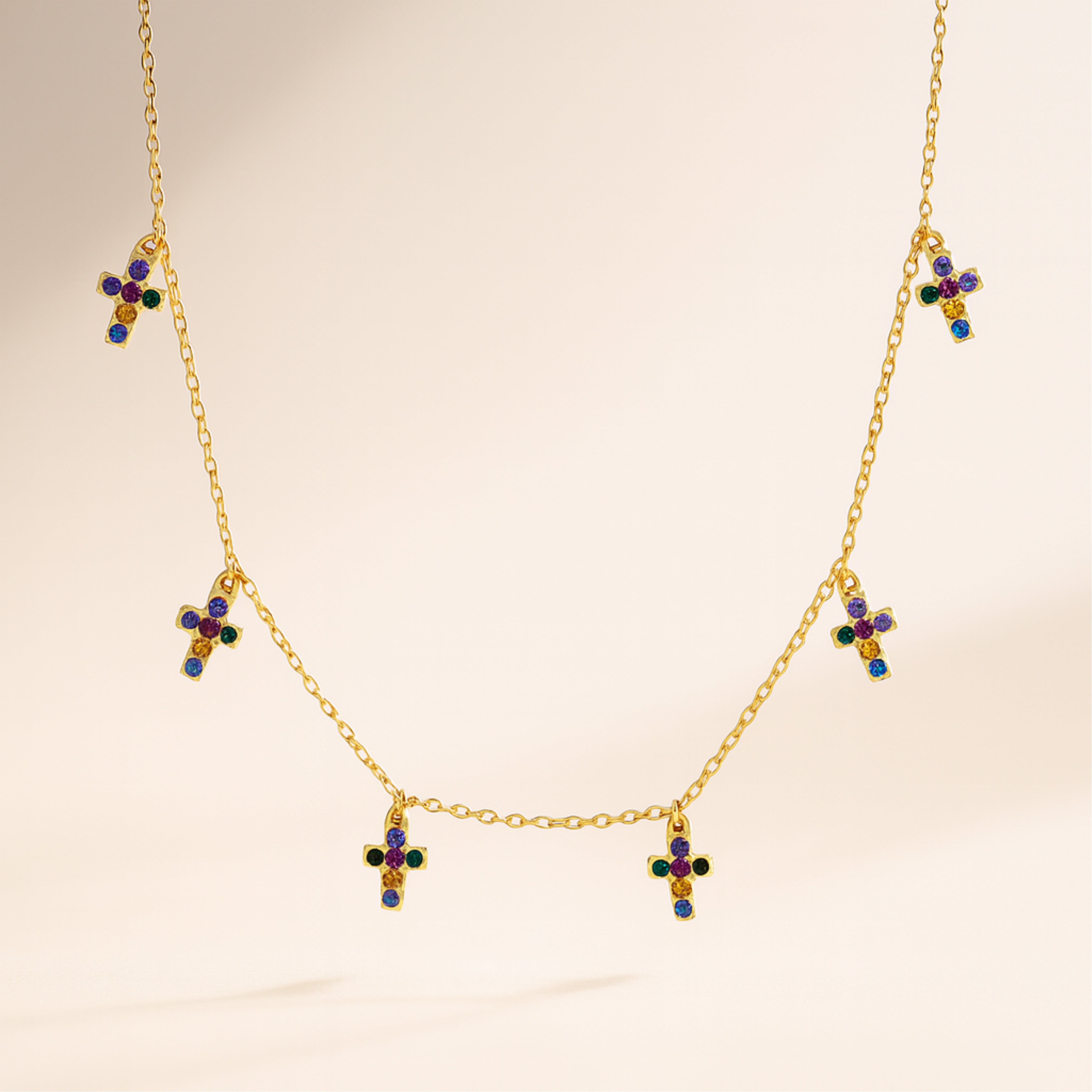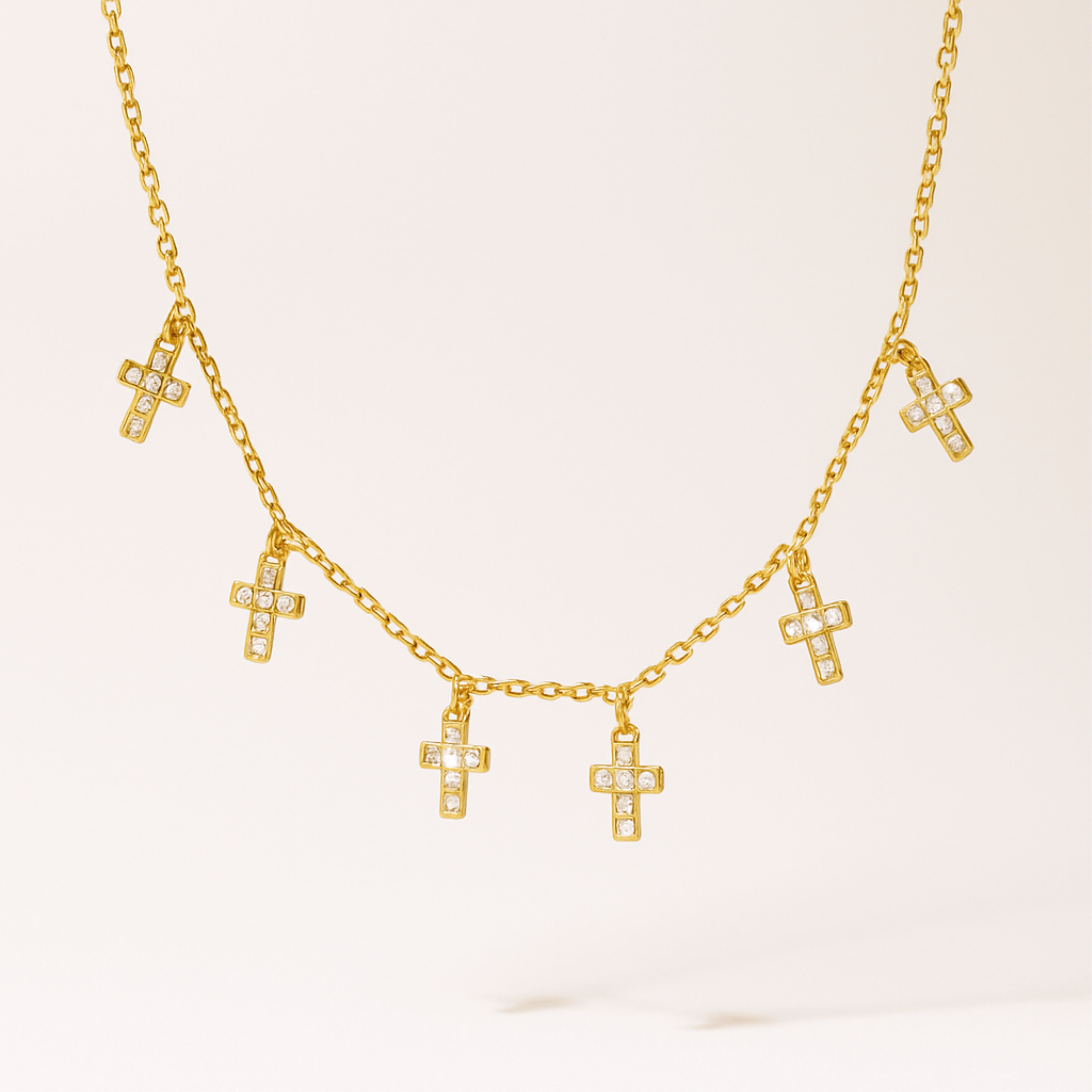 This delicate gold necklace features five tiny crystal-studded cross charms that catch the light with every movement. It’s a meaningful piece with a modern twist — perfect for layering or wearing solo. A little faith, a little shine.
