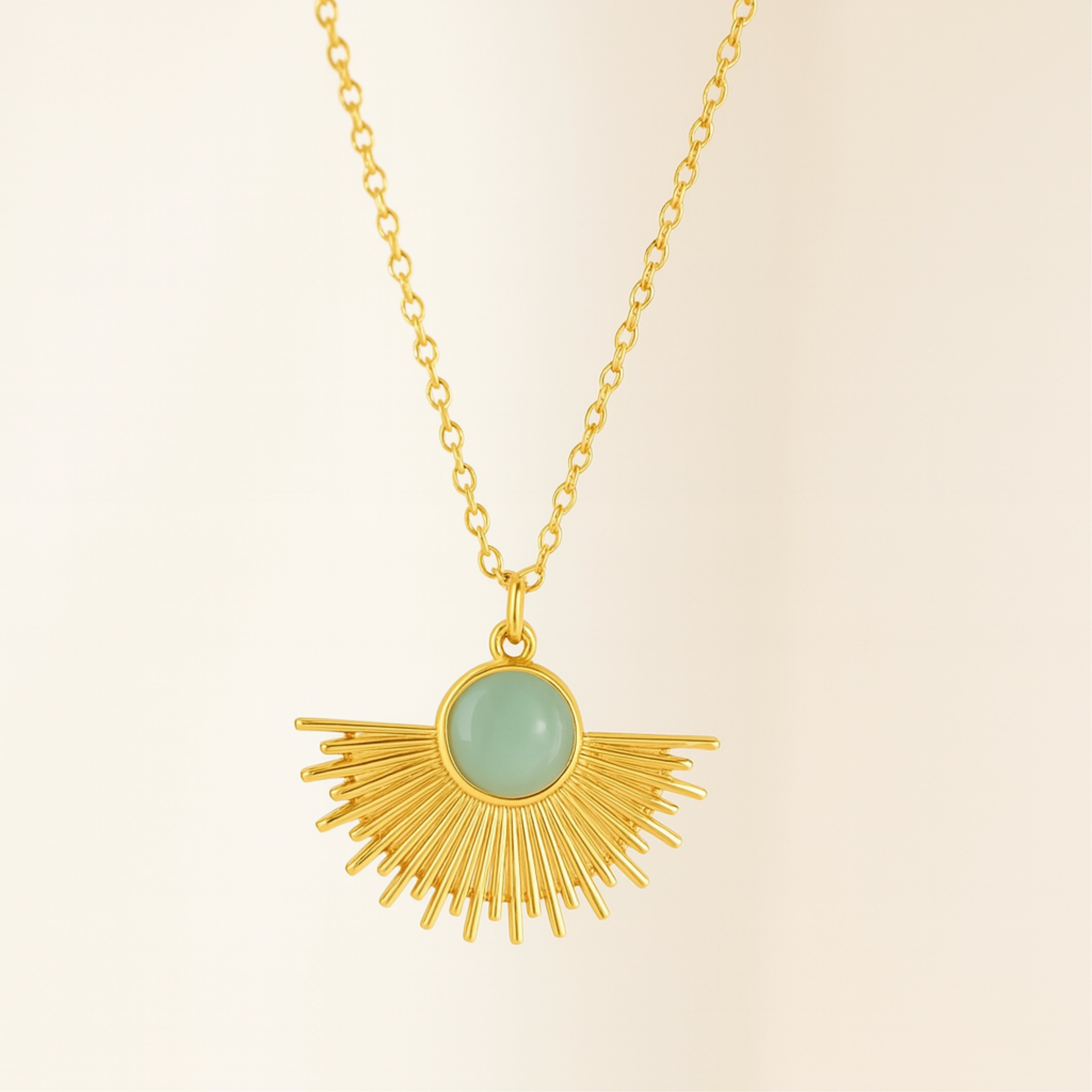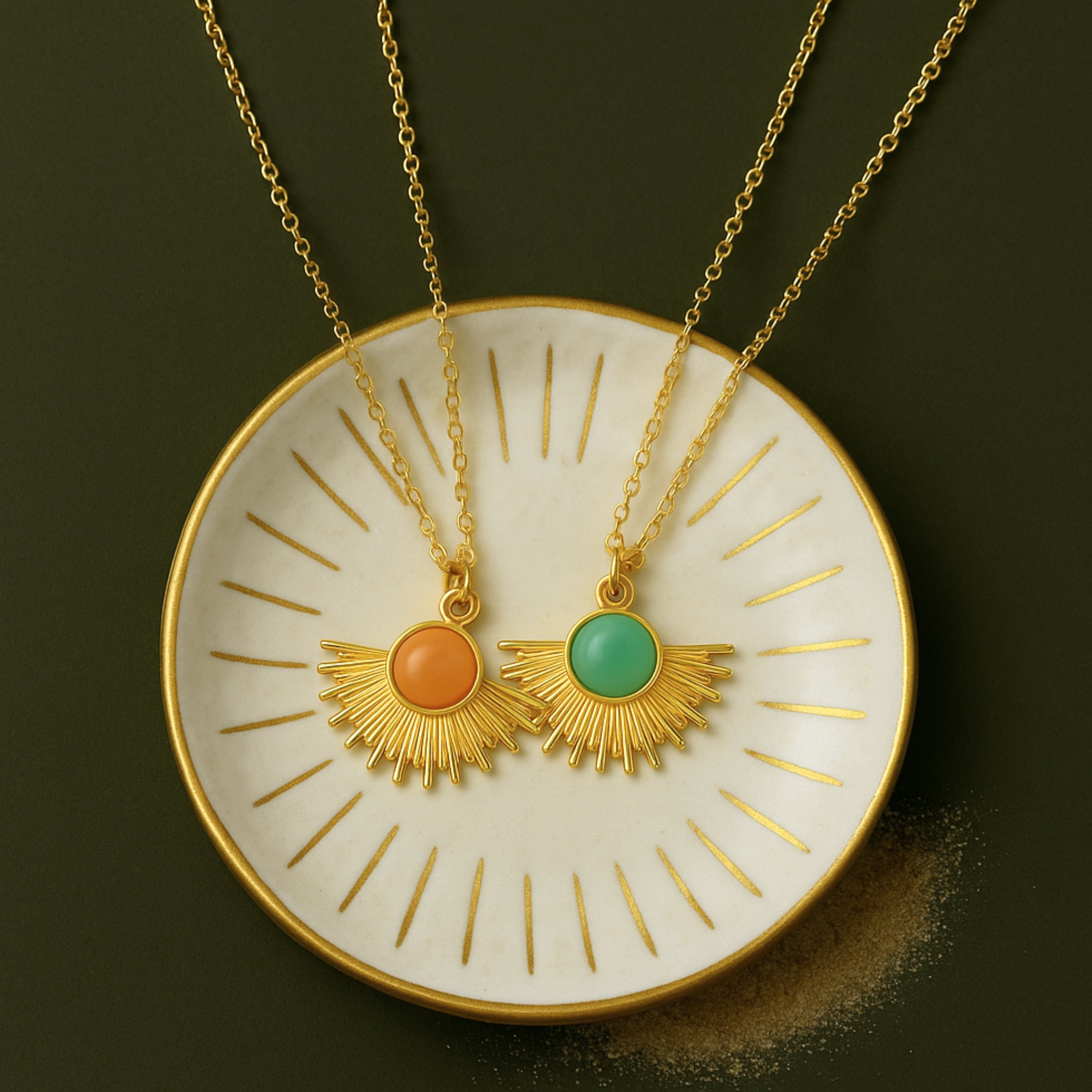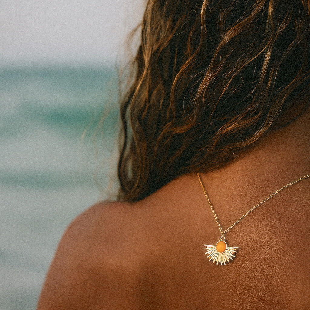 Meet the Dawnlight Necklace, a wearable sunrise designed to brighten your every day. With golden rays radiating from a soft green and orange stone, this pendant captures the calm and hope of early morning light. Whether worn as a solo statement or layered with ease, it’s a graceful nod to new beginnings and inner peace.