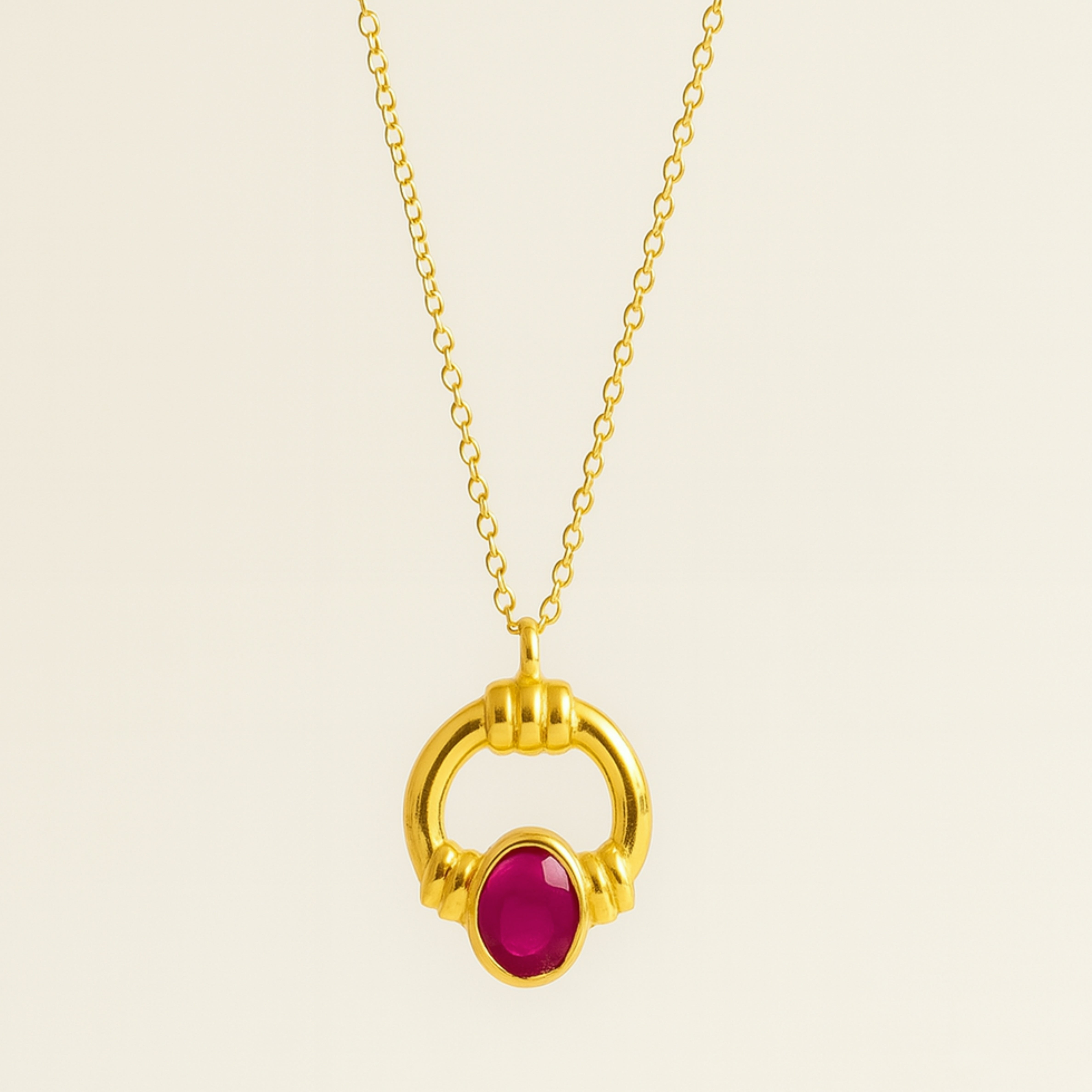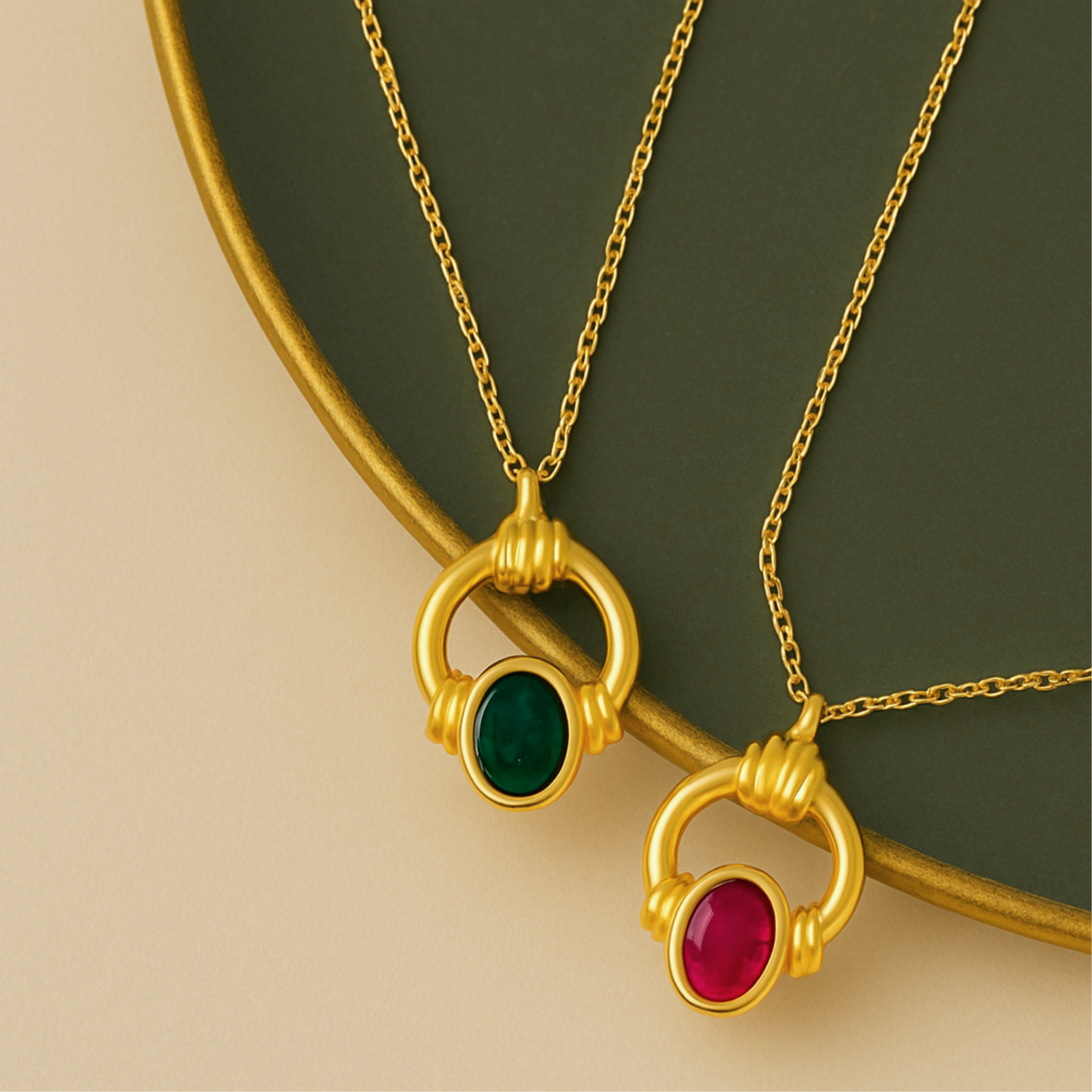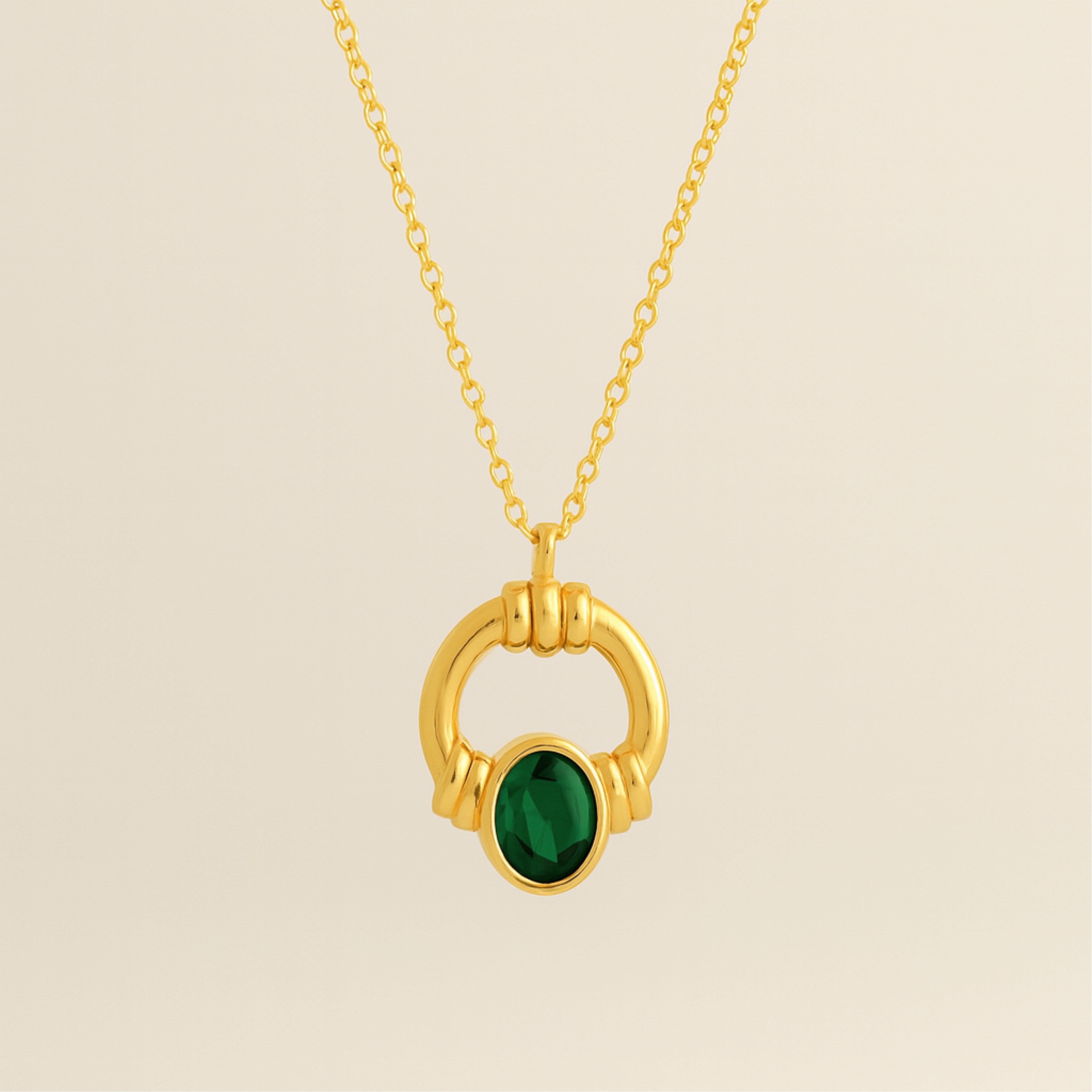 Channel regal, old-world charm with our Door-Knocker Pendant Necklace. A sculpted 18k gold plated necklace— a classic door knocker—frames a vivid 15x20mm oval cubic-zirconia for a rich pop of colour. The solid 925 sterling-silver core keeps the piece lightweight and hypoallergenic, while the fine cable chain (38cm extendable up to 48 cm) makes it effortless to layer with chokers and longer chains. From boardroom blouses to evening silk, this necklace adds an instant “quiet-luxury” focal point.