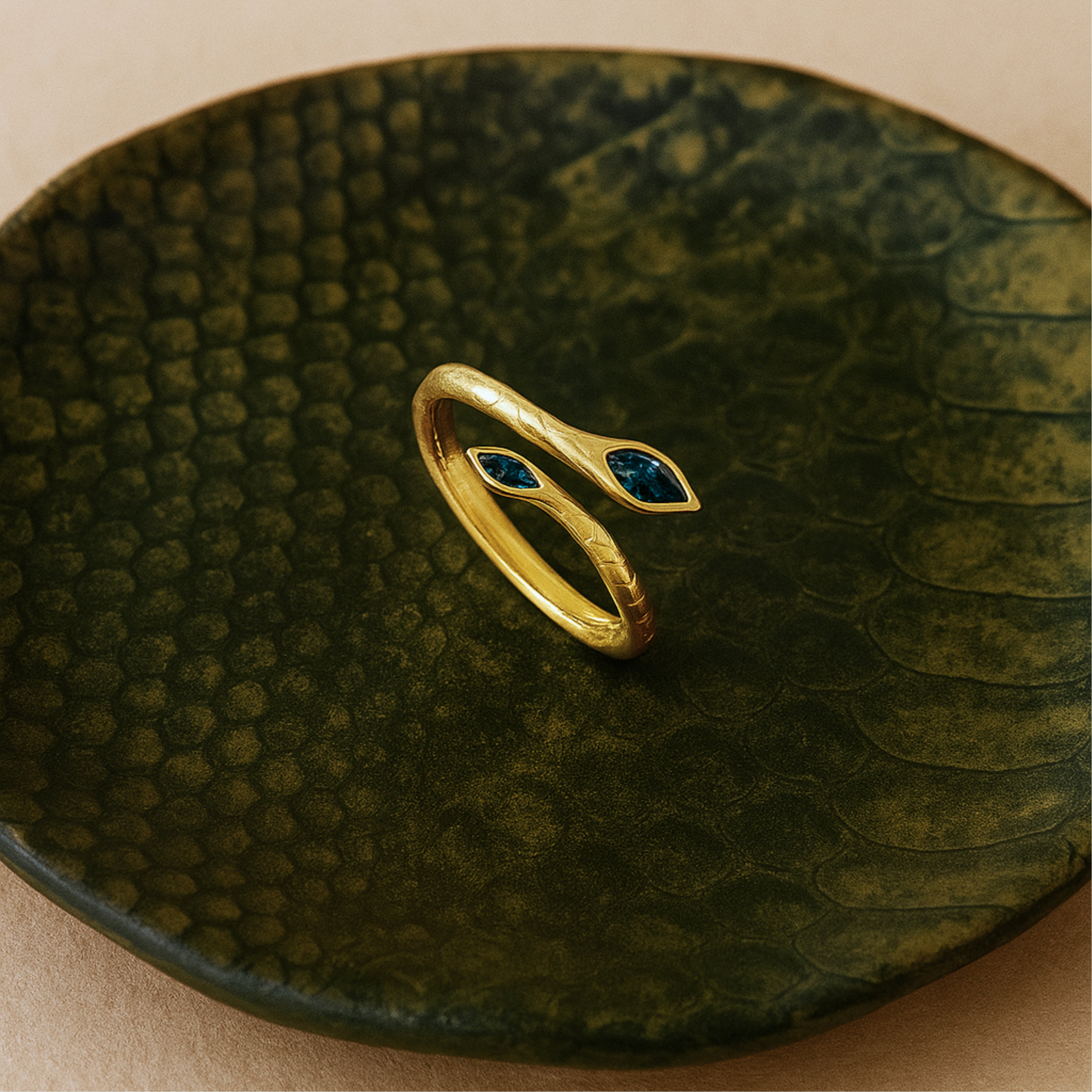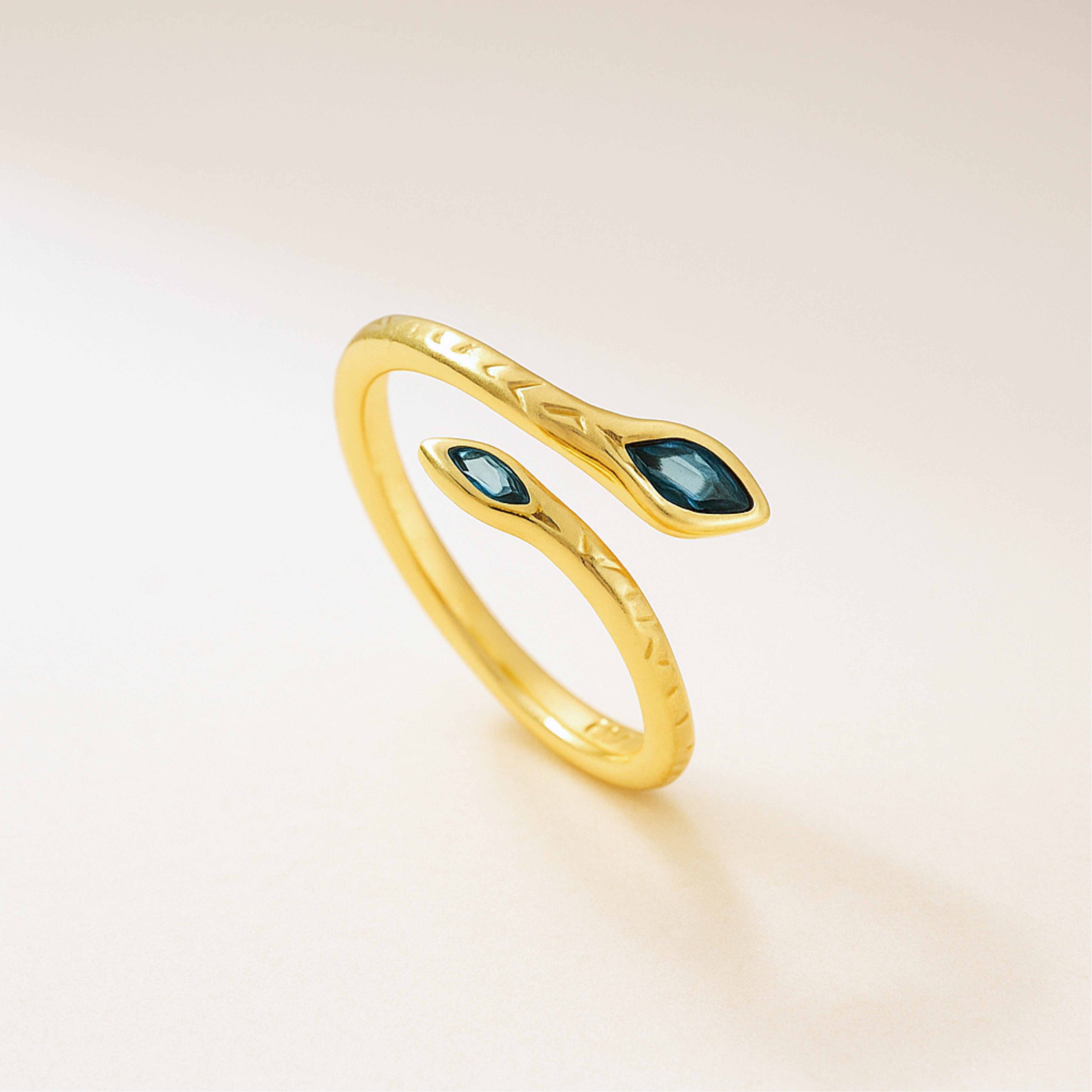 Slip a little edge onto your finger with this emerald-eye snake ring. The textured, 18 K gold-plated band coils gracefully, ending in two marquise-cut green cubic-zirconia “eyes” that shimmer every time you move. Light, slim, and elegant, it layers easily with your favourite gold bands but looks just as striking on its own.