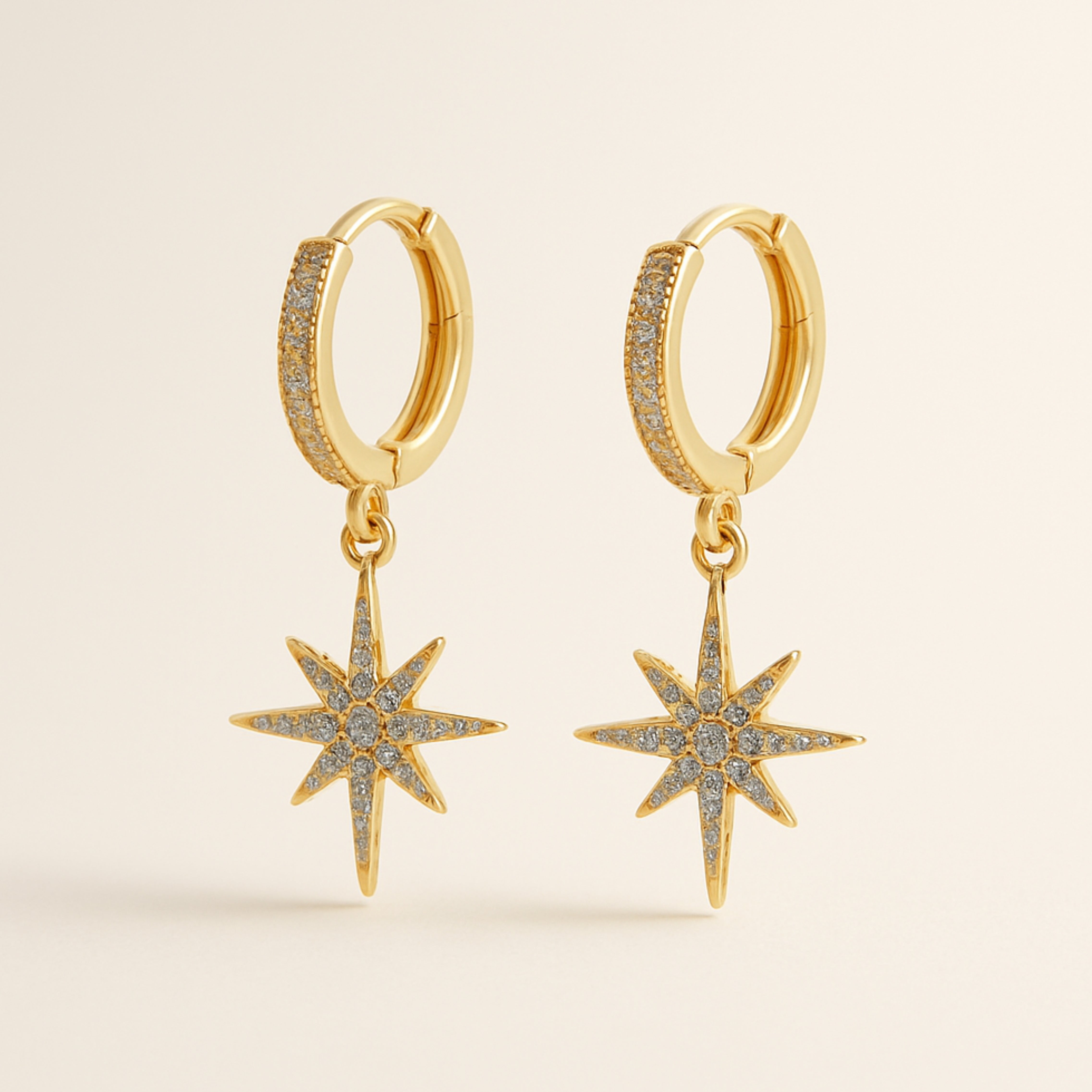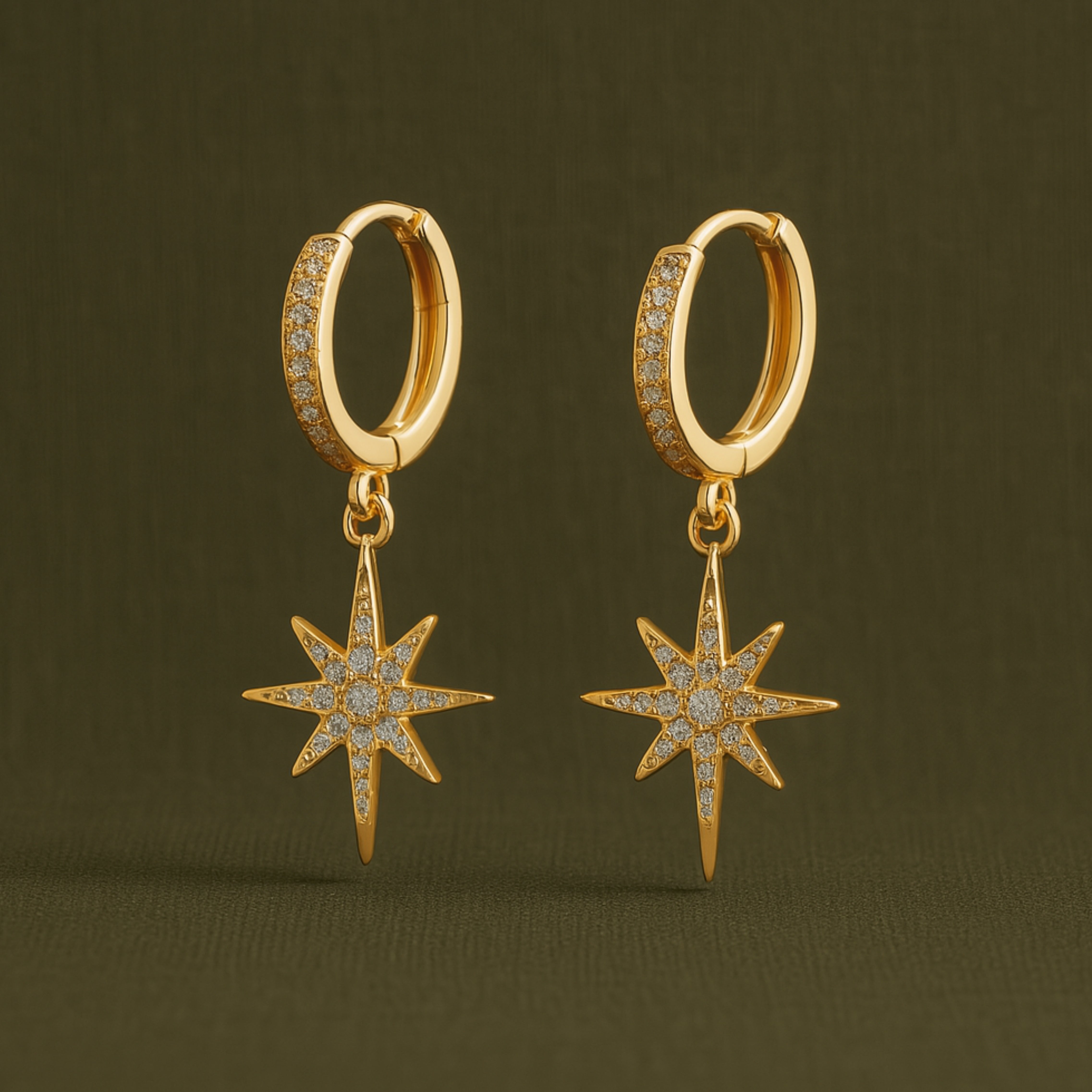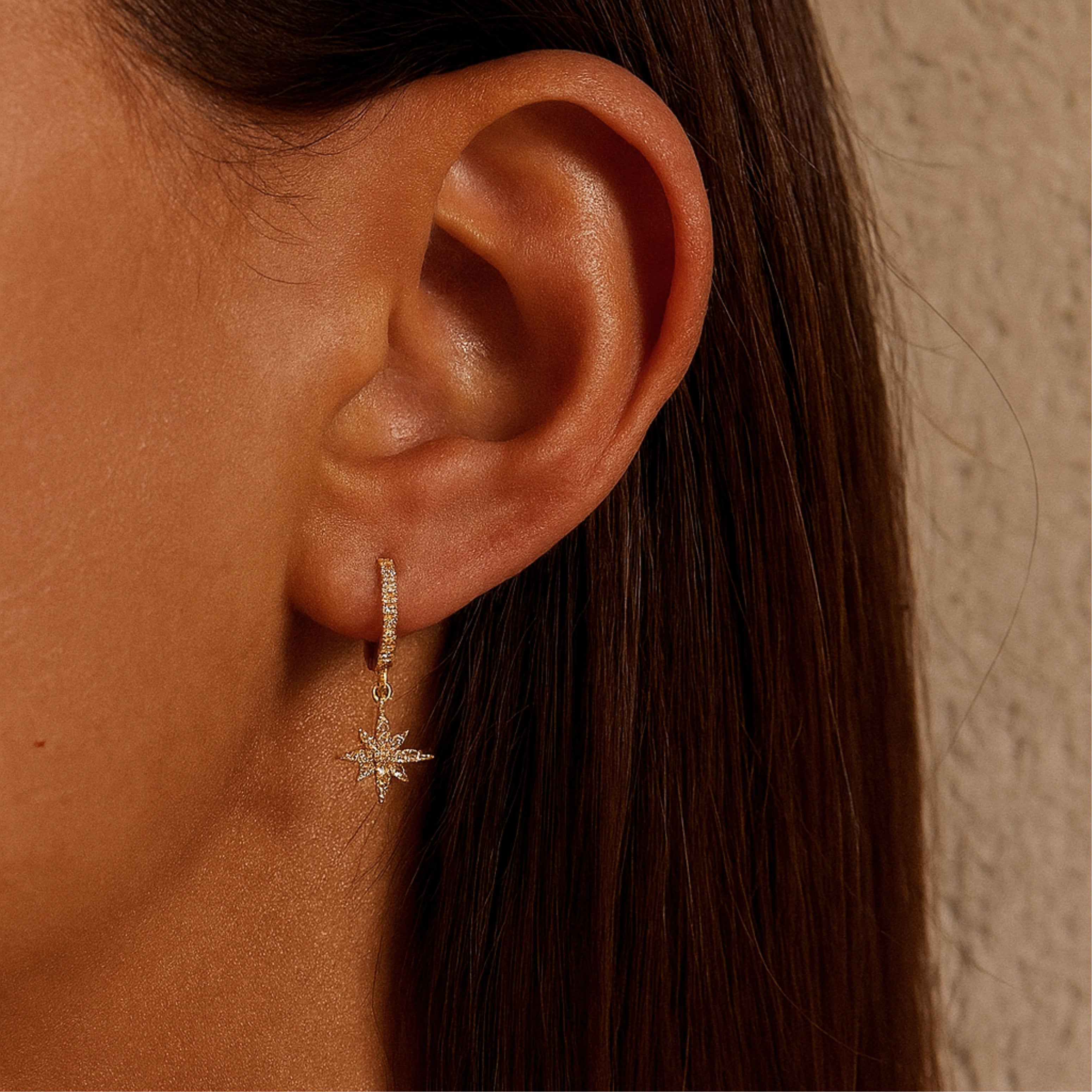 Follow your own true north. These North-Star pavé huggie earrings has eight-point star charms, each one hand-set with dozens of micro cubic-zirconia stones that shimmer like a midnight sky. Plated in premium 18 K gold over 925 sterling silver, they’re hypoallergenic and so light you’ll forget they’re there. Wear them solo for a subtle cosmic statement or stack them with tiny studs and cuffs for a full look.