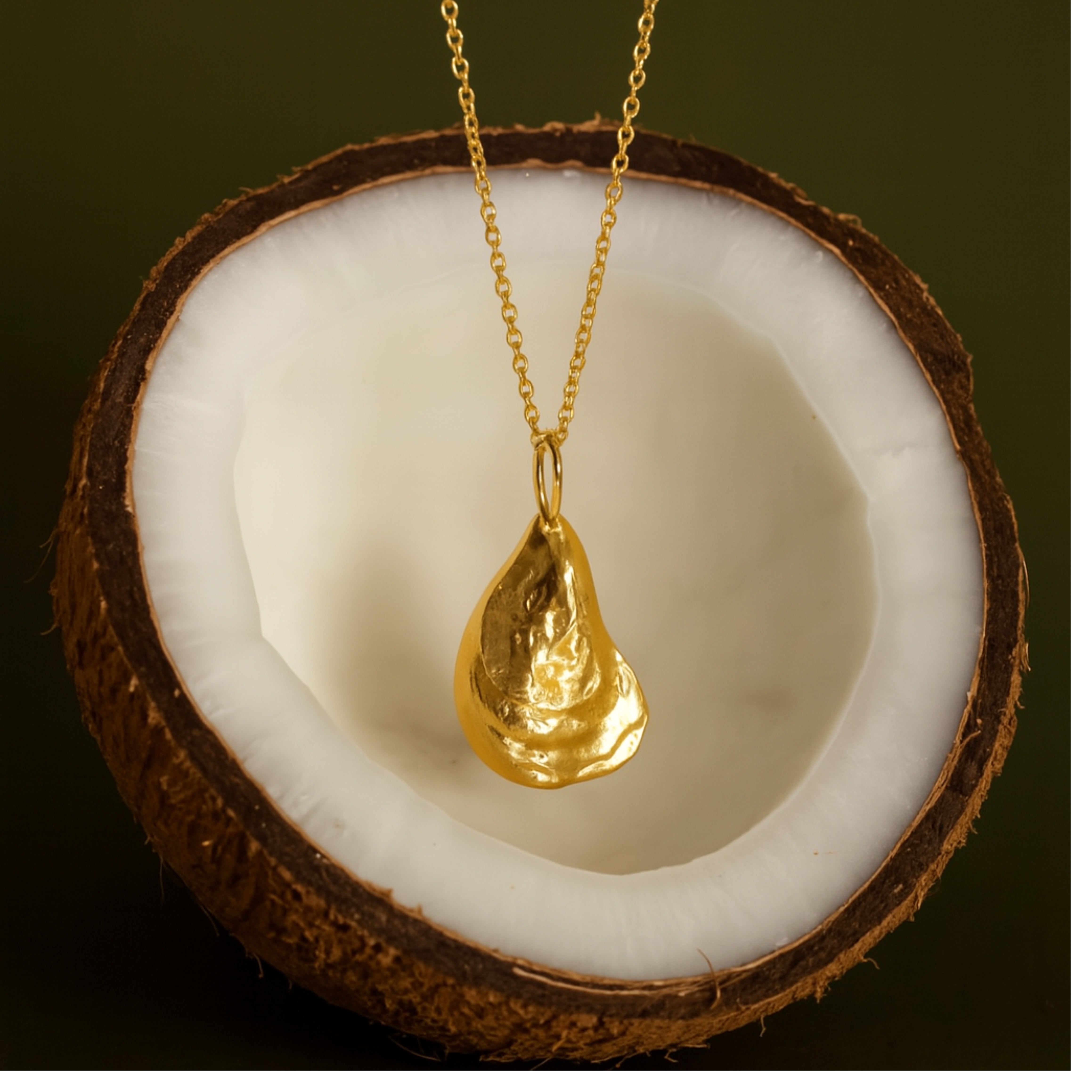 A quiet nod to nature’s raw elegance, the Golden Oyster Pendant Necklace is sculpted to resemble an organic oyster shell. Its fluid, molten texture evokes ocean tides and golden sunsets. Crafted in 18K gold-plated silver, this design is perfect for those drawn to effortless luxury with a story to tell. Style it solo or layer it with other sea-inspired treasures.