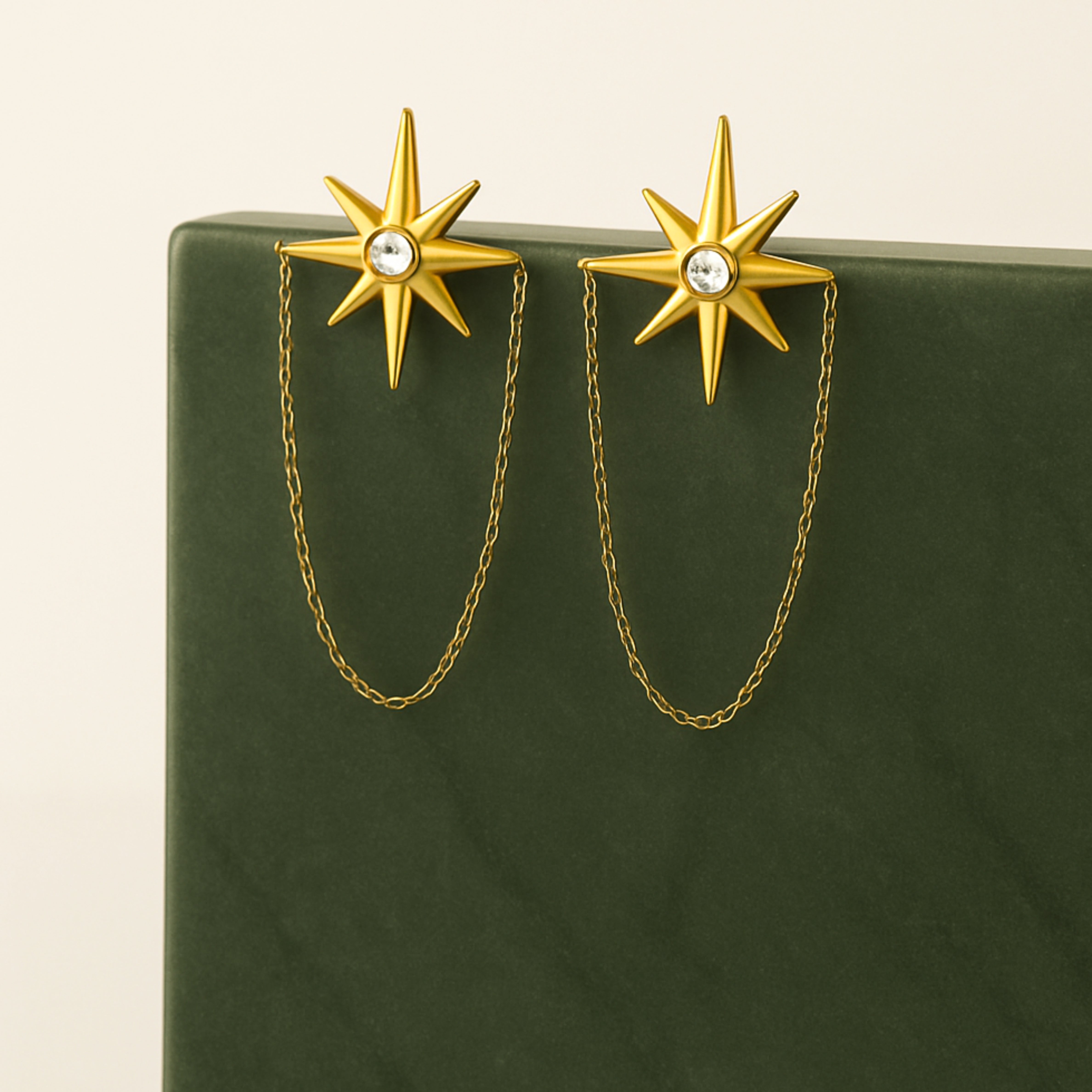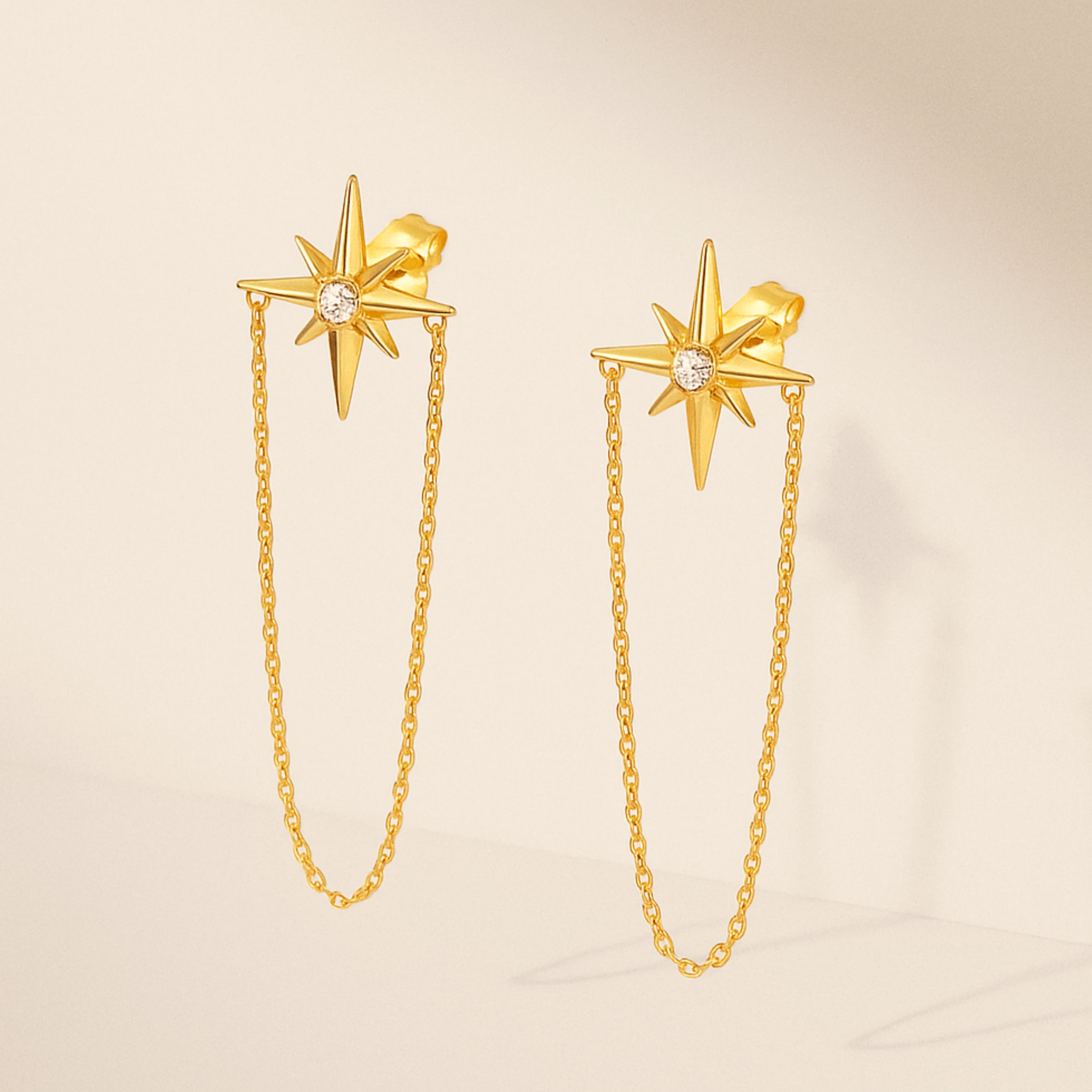 These North Star chain stud earrings feature an eight-point star set with a tiny clear CZ, while a whisper-thin gold chain drapes from front to back (or front to front) for effortless celestial sparkle. Plated in lush 18 K gold over 925 sterling silver, they’re nickel-free, hypoallergenic, and so light you’ll forget you’re wearing them—until the compliments start. Perfect for cosmic ear stacks, festival looks, or adding a subtle statement to everyday basics.