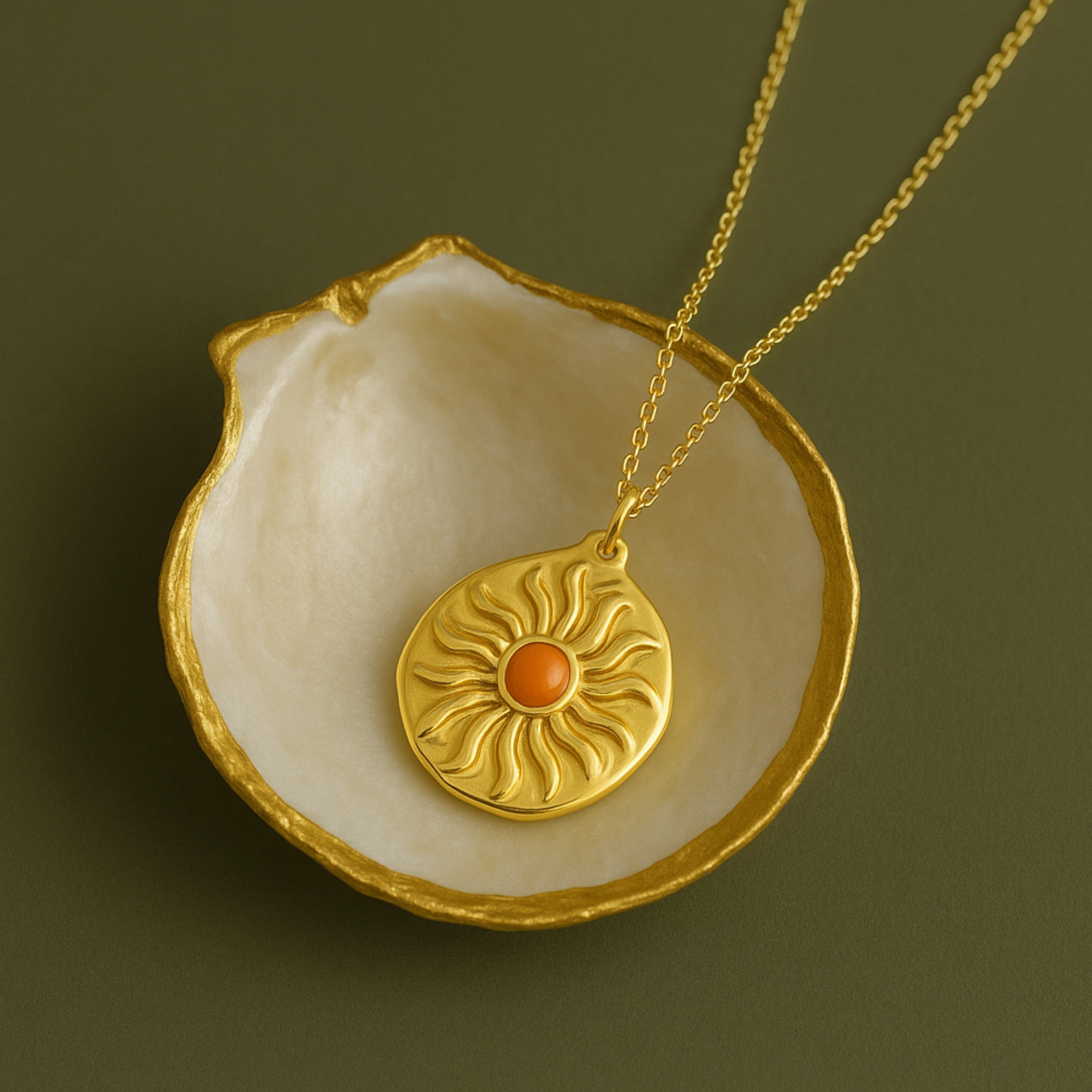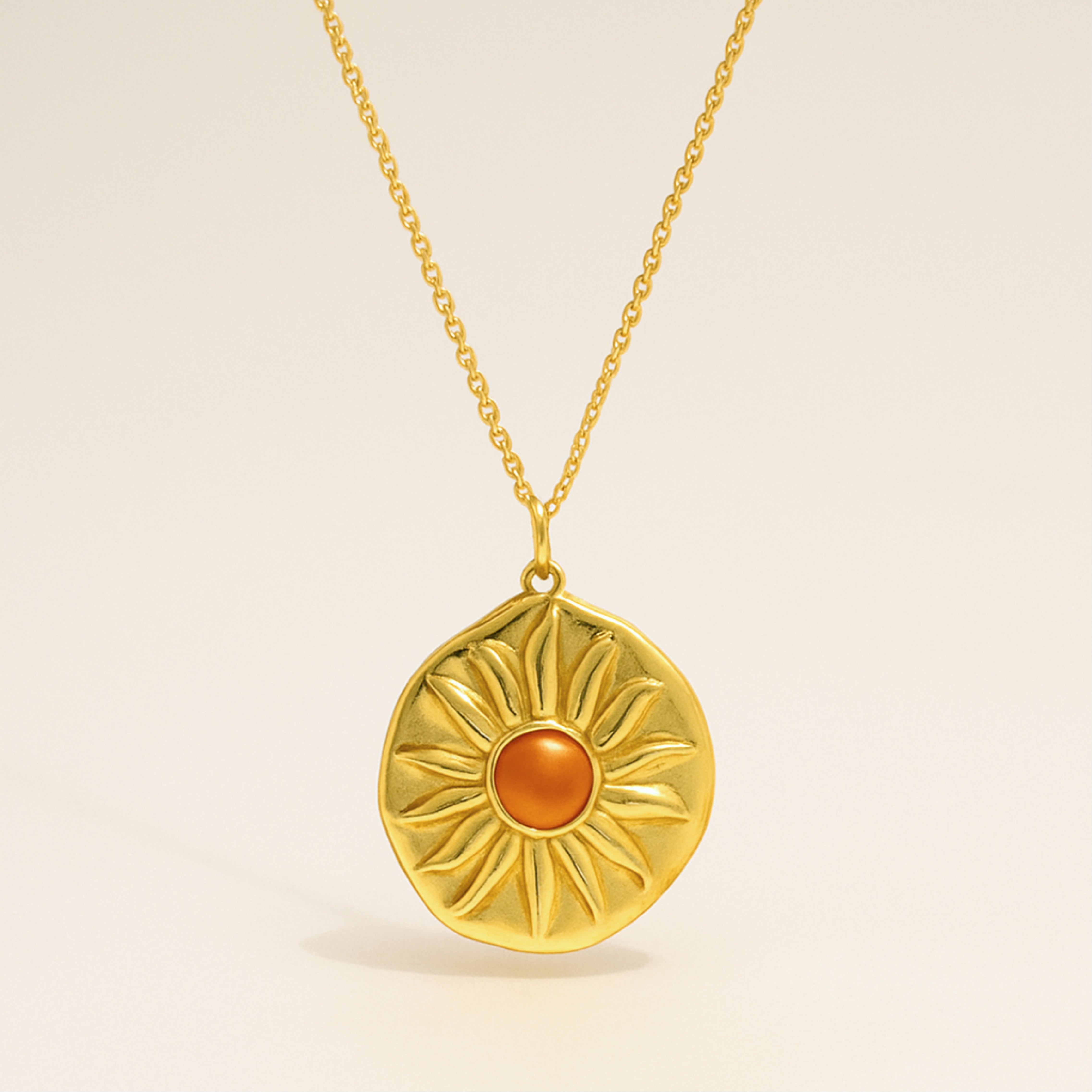 Inspired by the golden sun and organic textures of the natural world, the Solar Bloom Necklace embodies radiant femininity and quiet strength. Its hand-formed gold-toned pendant cradles a soft-glowing center bead, evoking the feeling of a warm sunrise on skin. Whether layered or worn solo, this piece is perfect for those who carry light wherever they go.