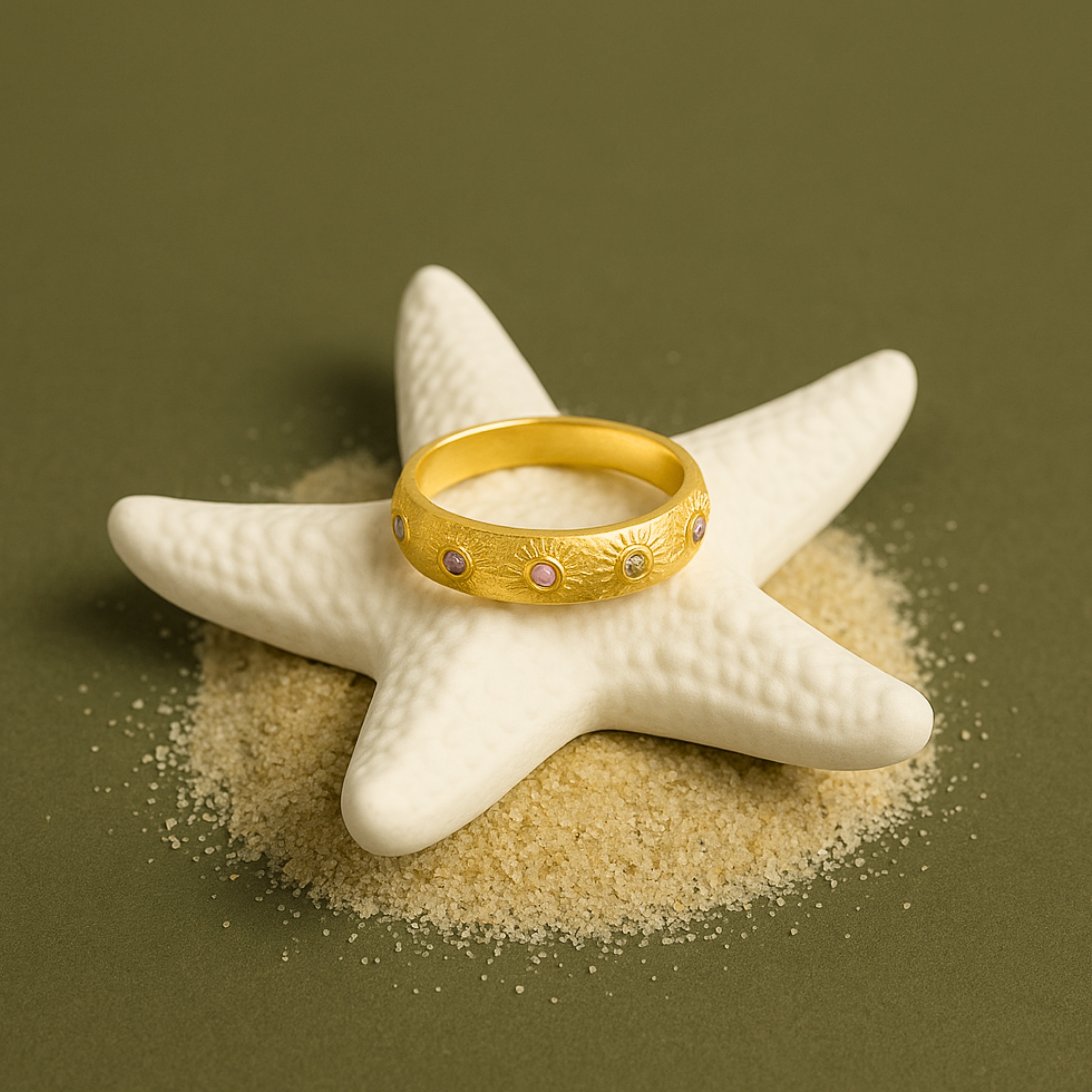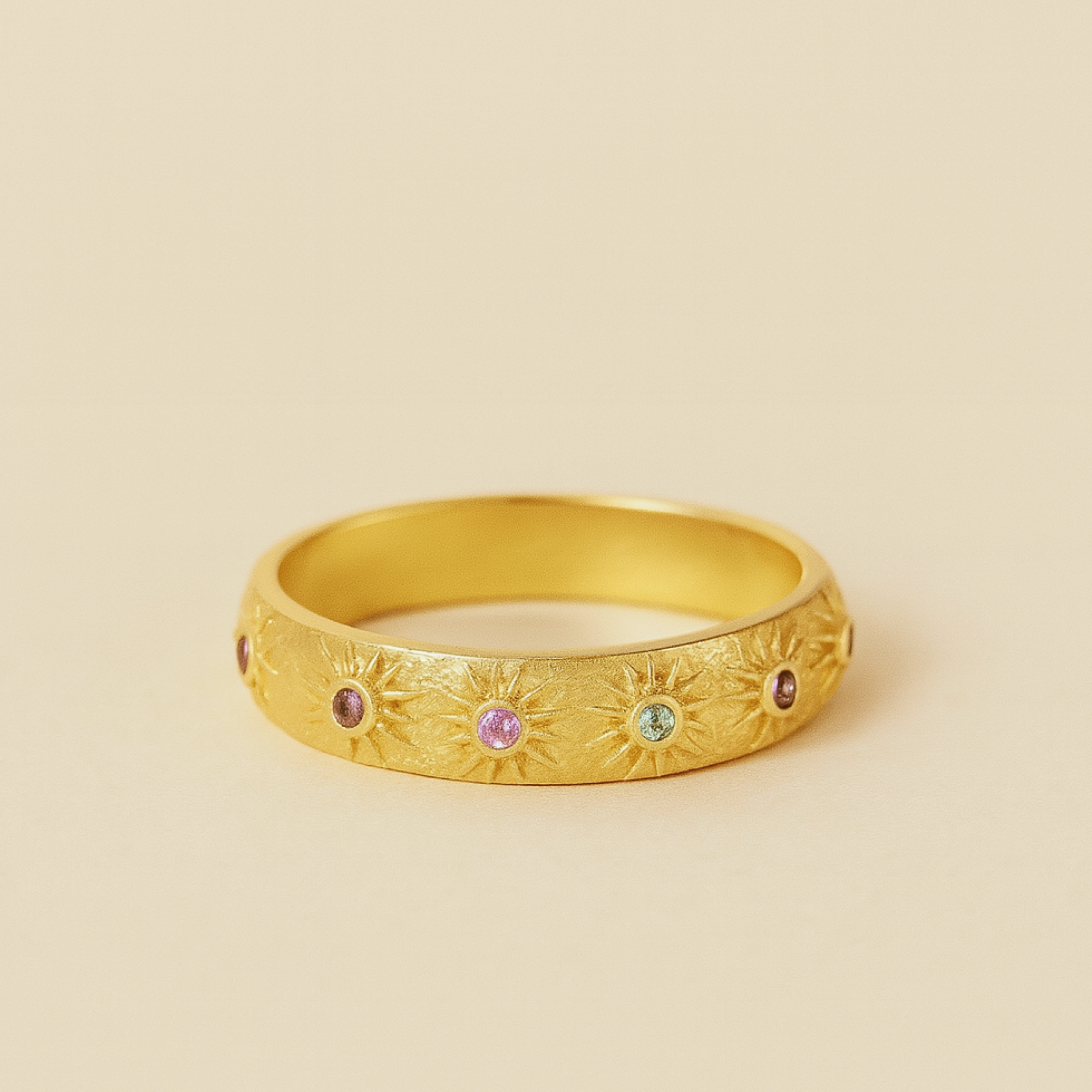 The Sunbeam Band looks like it was cast from warm sand at golden hour. A softly textured 18 K gold-plated ring is dotted all around with baby sun-burst engravings, each holding a pastel cubic-zirconia spark—blush pink, sea-glass mint, lavender haze. Wide enough to feel substantial, slim enough to stack, it’s built on nickel-free 925 sterling silver, so you get everyday comfort plus serious durability. Pair it with plain gold stackers, bright enamel, or let it shine solo; either way, you’ll carry a pocket of sunshine wherever you go.