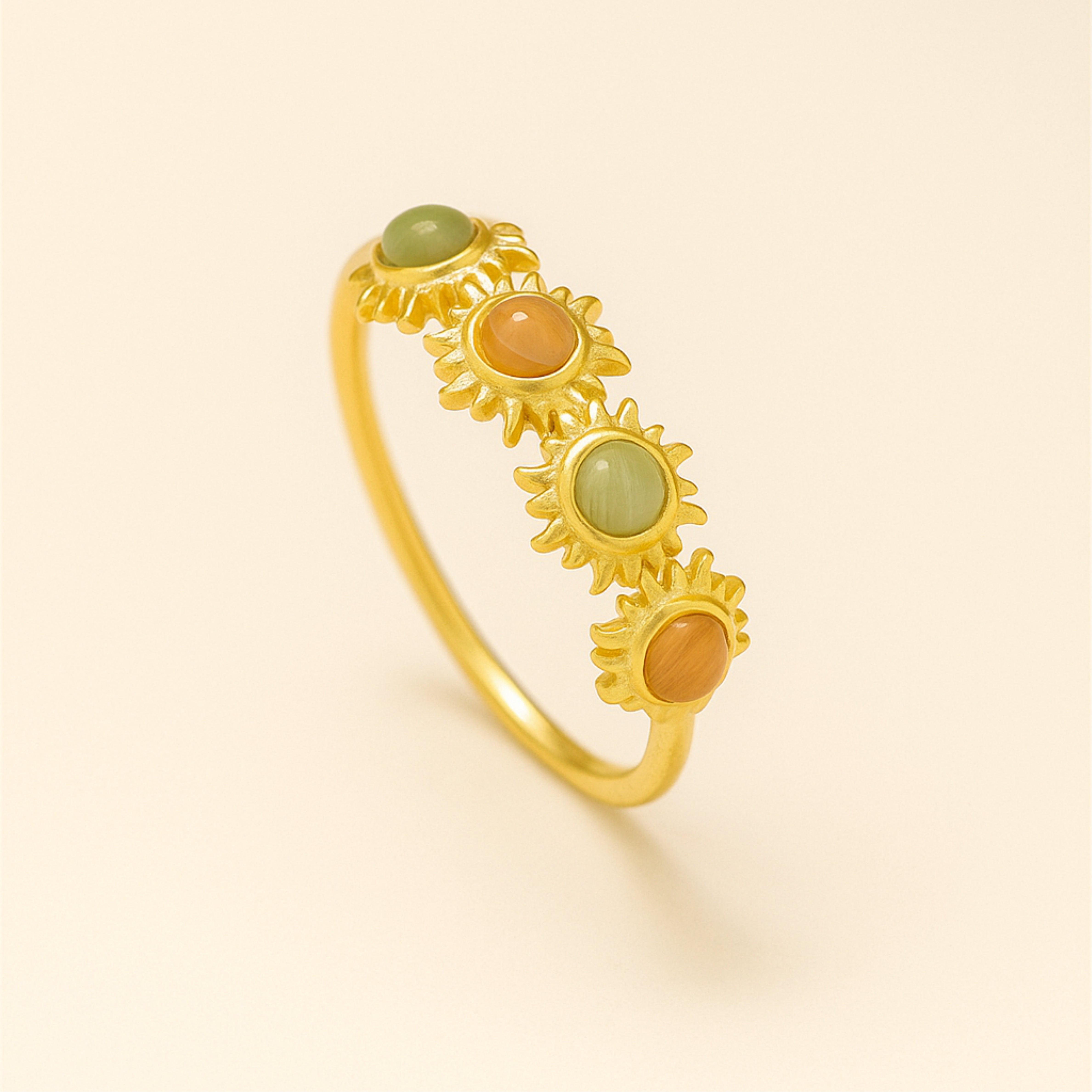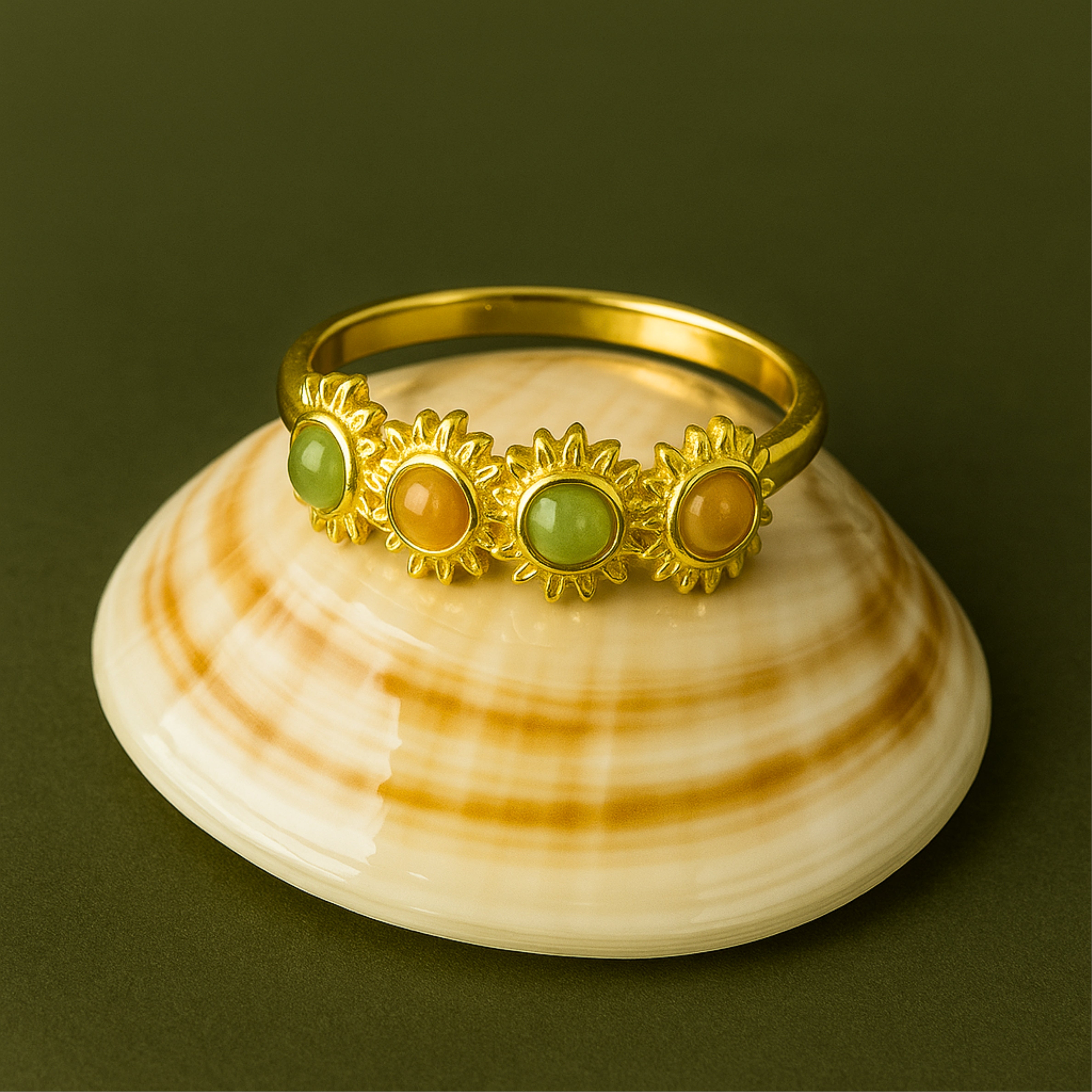 Channel warm, golden-hour energy with this sunflower opal ring. Four tiny blossoms, each hugging a glowing cabochon—soft green and peachy-orange—line a slim 18 K gold-plated band. Lightweight and stack-friendly, it’s an easy way to slip a little sunshine onto any finger, any day.