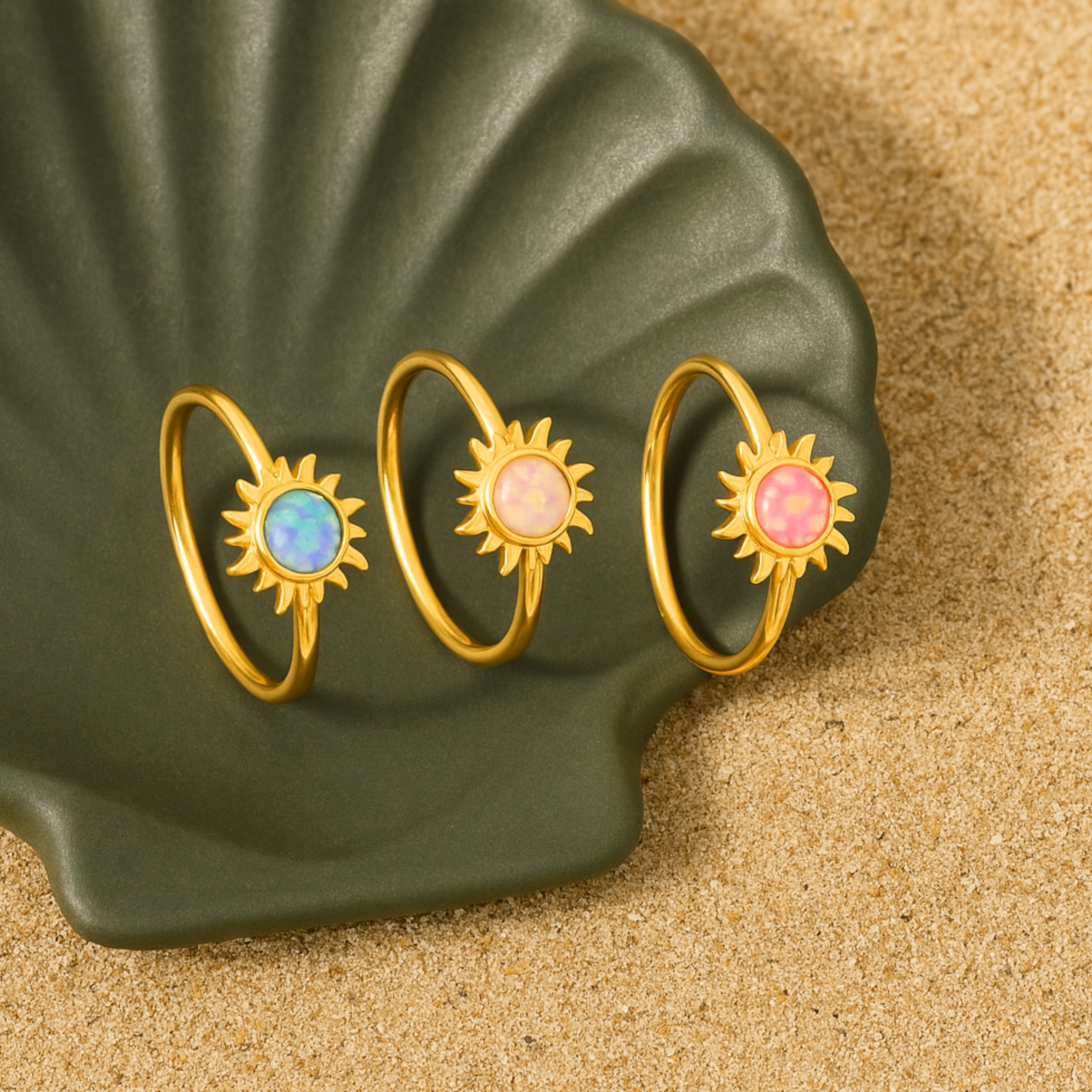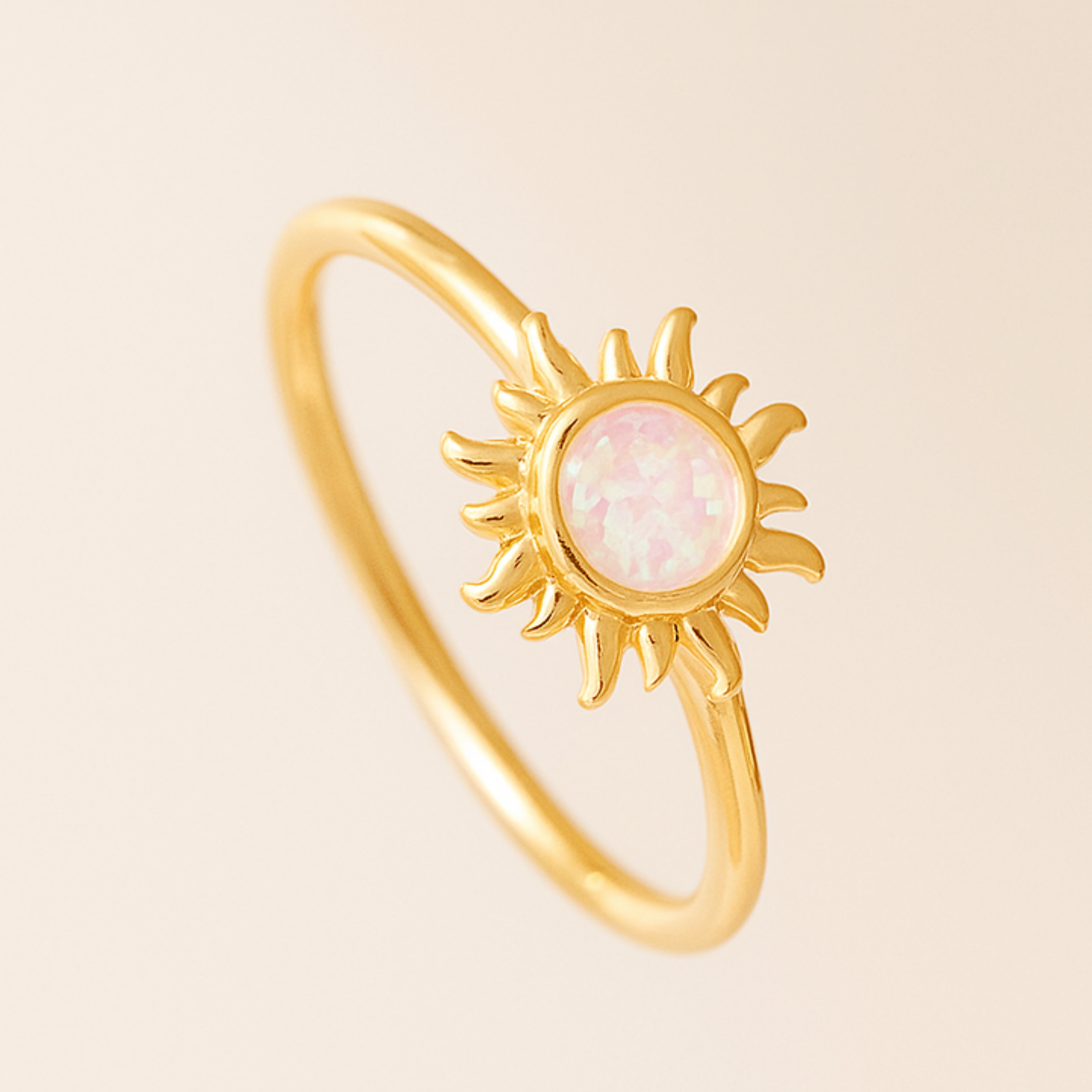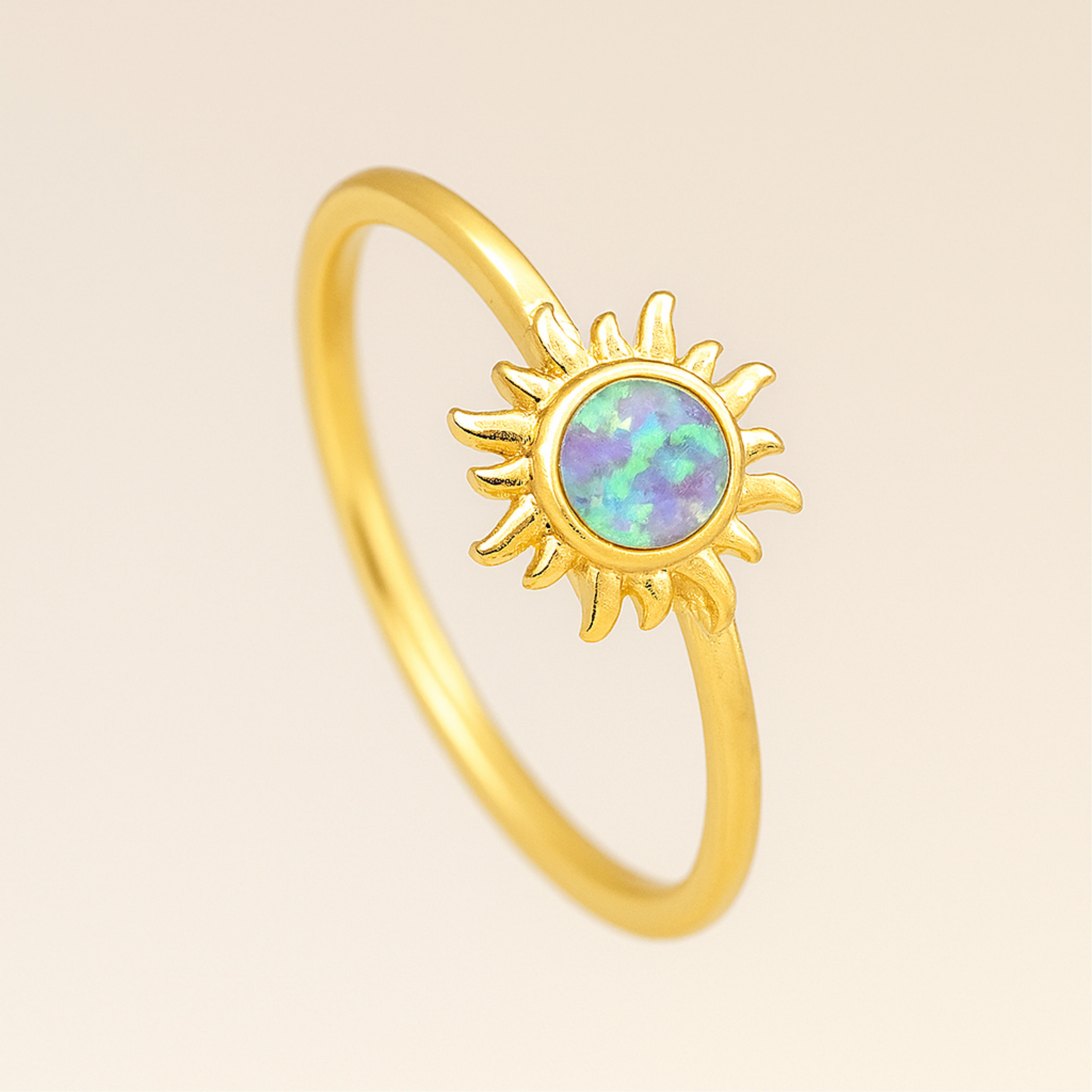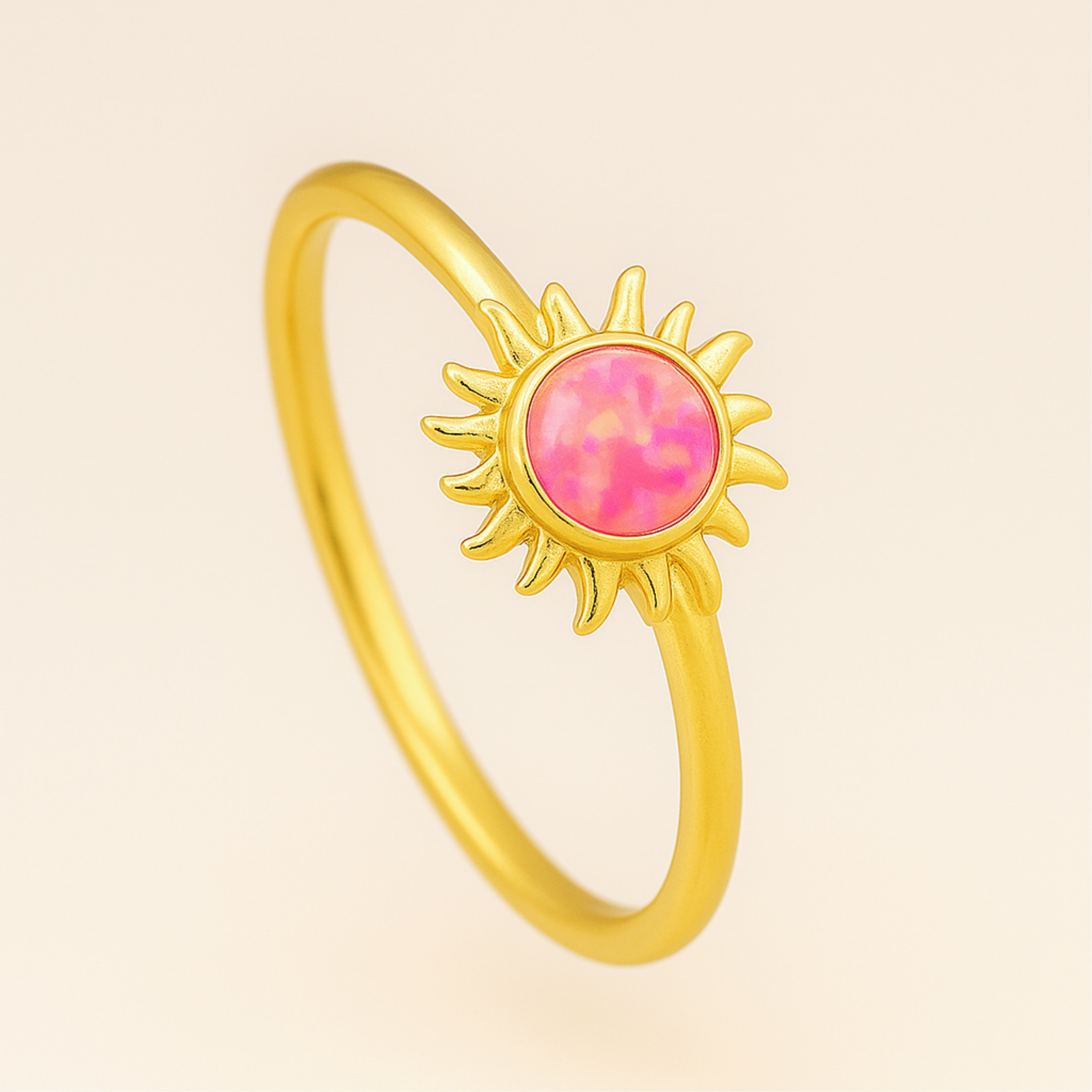 Catch a sunrise on your hand. The Sunrise Opal Ring sets a round opal inside a tiny gold sunburst. Choose bright pink, light purple-blue, or soft blush pink—each flickers with rainbow light when it hits the sun. A simple 18 K gold-plated band and nickel-free 925 sterling silver core keep things comfy and hypoallergenic. Stack it with plain gold bands, pearls, or gemstone rings for instant beach-day energy… or let it glow solo as your personal pocket of sunshine.