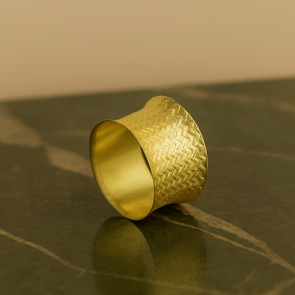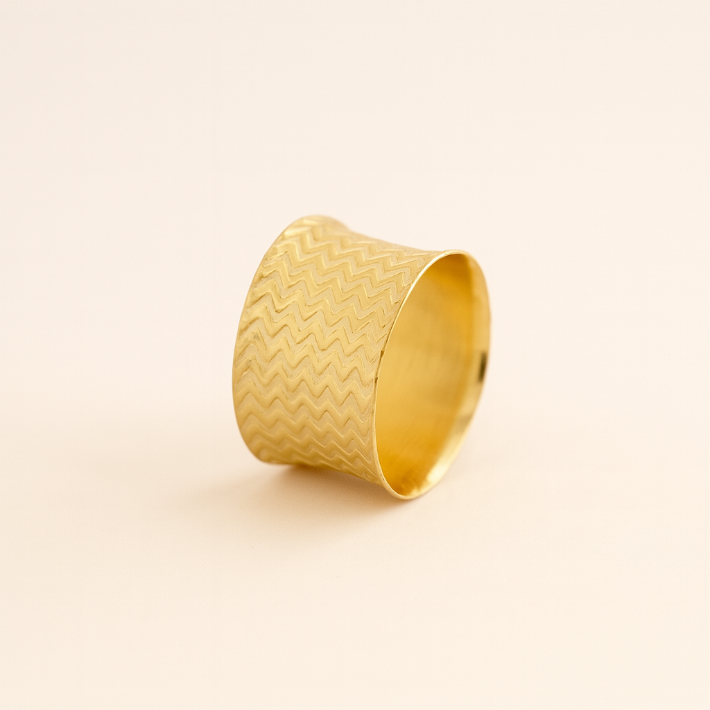 A bold band with a soft, natural rhythm. The Wave Ring is inspired by flowing movement, with a gently textured surface that feels both organic and refined. Crafted in solid 925 sterling silver and finished in warm 18k gold, its flared shape and matte-polished finish add depth without overdoing it. It’s the kind of piece that quietly stands out—sculptural, tactile, and easy to wear. Stack it with smooth bands or let it shine on its own.